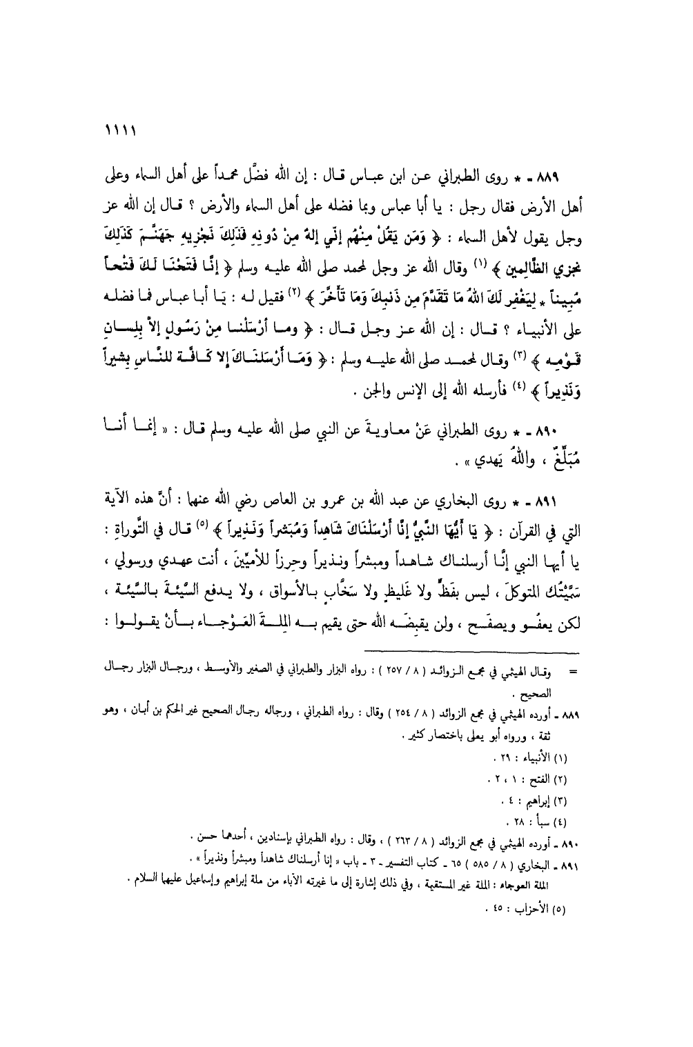 889 - * روى الطبراني عن ابن عباس قال: إن الله فضل محمداً على أهل السماء وعلى أهل الأرض فقال رجل: يا أبا عباس وبما فضله على أهل السماء والأرض؟ قال إن الله عز وجل يقول لأهل السماء: {وَمَنْ يَقُلْ مِنْهُمْ إِنِّي إِلَهٌ مِنْ دُونِهِ فَذَلِكَ نَجْزِيهِ جَهَنَّمَ كَذَلِكَ نَجْزِي الظَّالِمِينَ} (1) وقال الله عز وجل لمحمد صلى الله عليه وسلم {إِنَّا فَتَحْنَا لَكَ فَتْحًا مُبِينًا * لِيَغْفِرَ لَكَ اللَّهُ مَا تَقَدَّمَ مِنْ ذَنْبِكَ وَمَا تَأَخَّرَ} (2) فقيل له: يا أبا عباس فما فضله على الأنبياء؟ قال: إن الله عز وجل قال: {وَمَا أَرْسَلْنَا مِنْ رَسُولٍ إِلَّا بِلِسَانِ قَوْمِهِ} (3) وقال لمحمد صلى الله عليه وسلم: {وَمَا أَرْسَلْنَاكَ إِلَّا كَافَّةً لِلنَّاسِ بَشِيرًا وَنَذِيرًا} (4) فأرسله الله إلى الإنس والجن.
