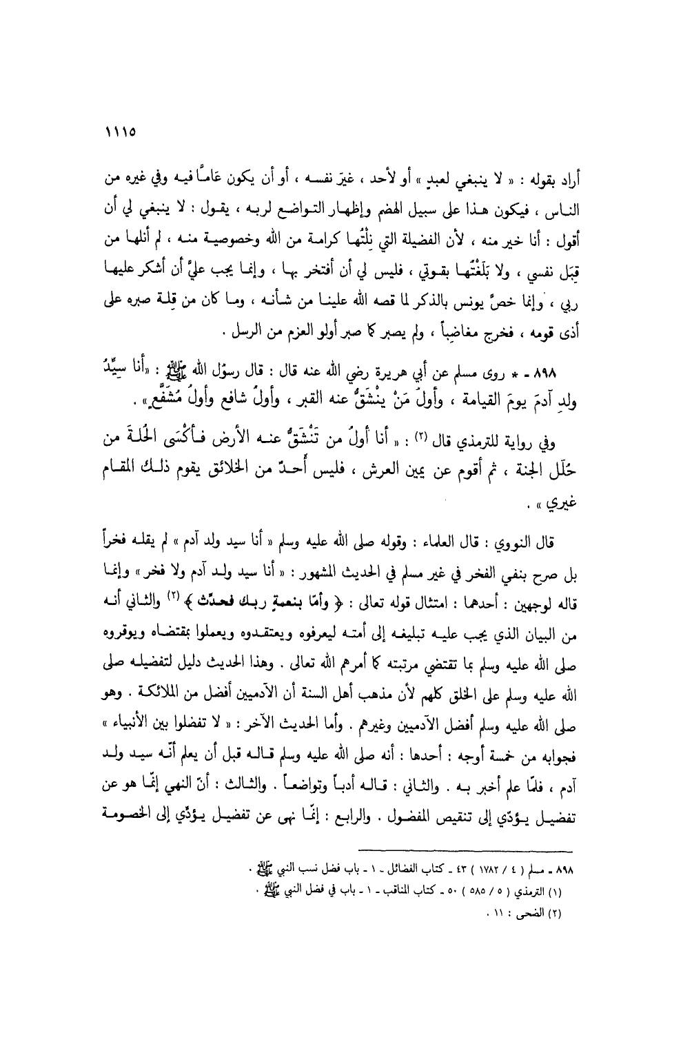 قال النووي: قال العلماء: وقوله صلى الله عليه وسلم "أنا سيد ولد آدم" لم يقله فخراً بل صرح بنفي الفخر في غير مسلم في الحديث المشهور: "أنا سيد ولد آدم ولا فخر" وإنما قاله لوجهين: أحدهما: امتثال قوله تعالى: {وَأَمَّا بِنِعْمَةِ رَبِّكَ فَحَدِّثْ} (2) والثاني أنه من البيان الذي يجب عليه تبليغه إلى أمته ليعرفوه ويعتقدوه ويعملوا بمقتضاه ويوقروه صلى الهل عليه وسلم بما تقتضي مرتبته كما أمرهم الله تعالى. وهذا الحديث دليل لتفضيله صلى الله عليه وسلم على الخلق كلهم لأن مذهب أهل السنة أن الآدميين أفضل من الملائكة. وهو صلى الله عليه وسلم أفضل الآدميين وغيرهم. وأما الحديث الآخر: "لاتفضلوا بين الأنبياء" فجوابه من خمسة أوجه: أحدها: أنه صلى الله عليه وسلم قاله قبل أن يعلم أنه سيد ولد آدم، فلما علم أخبر به. والثاني: قاله أدباً وتواضعاً. والثالث: أن النهي إنما هو عن تفضيل يؤدي إلى تنقيص المفضول. والرابع: إنما نهى عن تفضيل يؤدي إلى الخصومة