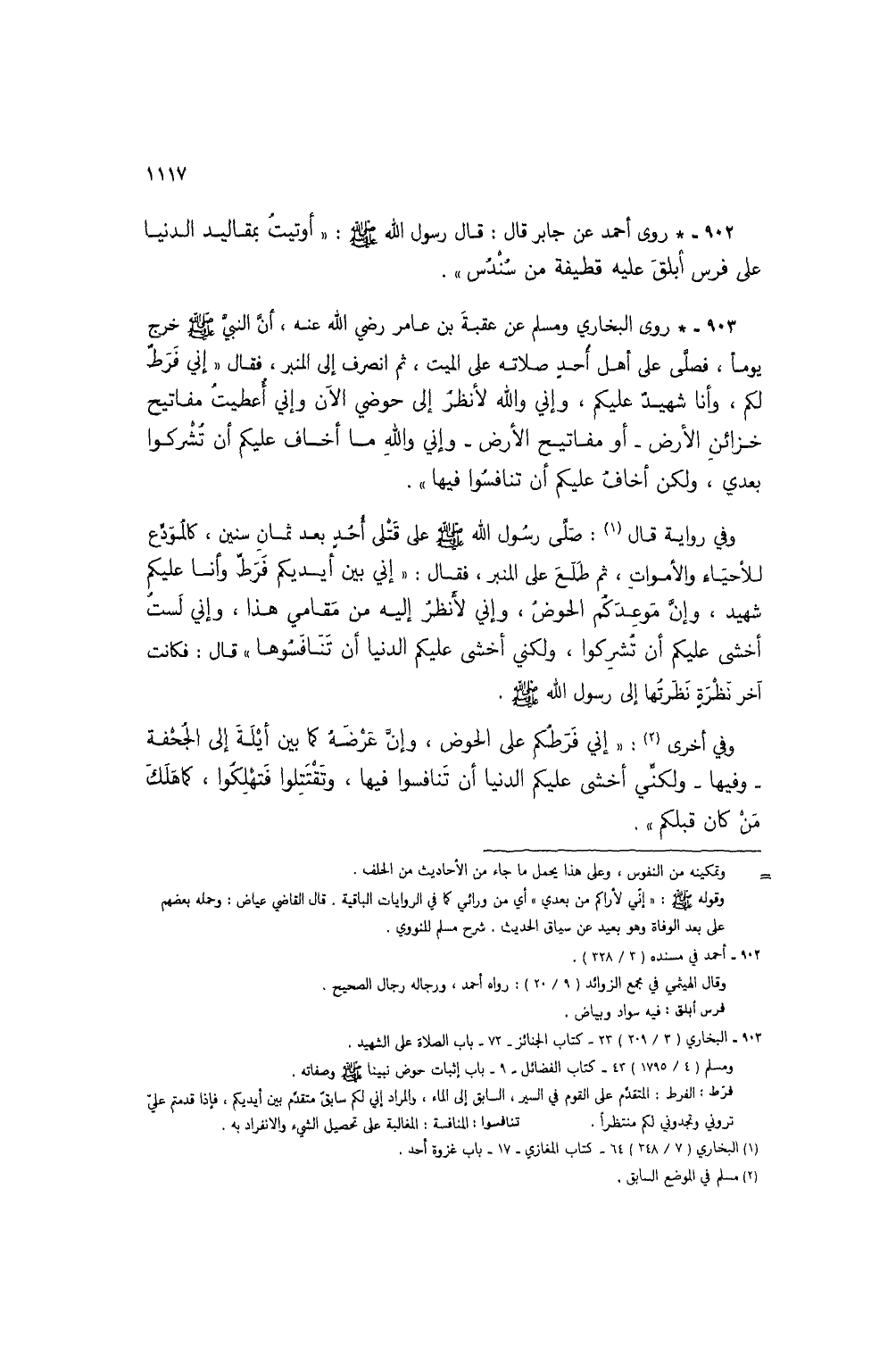 903 - * روى البخاري ومسلم عن عقبة بن عامر رضي الله عنه، أن النبي صلى الله عليه وسلم خرج يوماً، فصلى على أهل أُحدٍ صلاته على الميت، ثم انصرف إلى المنبر، فقال "إني فرطٌ لكم، وأنا شهيدٌ عليكم، وإني والله لأنظر إلى حوضي الآن وإني أعطيتُ مفاتيح خزائن الأرض - أو مفاتيح الأرض - وإني والله ما أخاف عليكم أن تُشركوا بعدي، ولكن أخافُ عليكم أن تنافسُوا فيها".