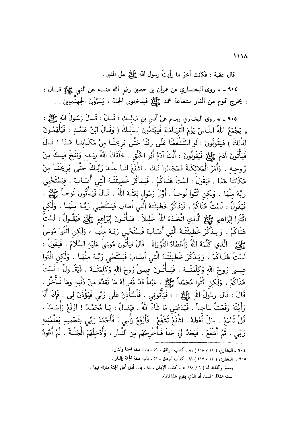 904 - * روى البخاري عن عمران بن حصي نرضي الله عنه عن النبي صلى الله عليه سلم قال: "يخرج قوم من النار بشفاعة محمد صلى الله عليه وسلم فيدخلون الجنة، يُسمون الجهنميين".