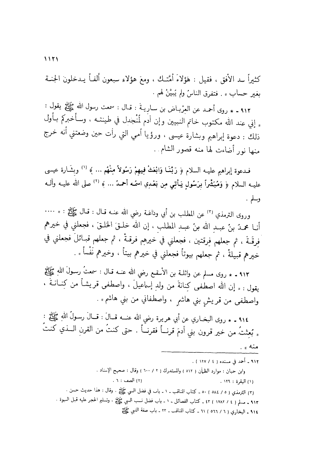 913 - * روى مسلم عن واثلة بن الأسقع رضي الله عنه قال: سمعتُ رسول الله صلى الله عليه وسلم يقول: "إن الله اصطفى كنانة من ولد إسماعيل، واصطفى قريشاً من كنانة، واصطفى من قريش بني هاشمن واصطفاني من بني هاشم".