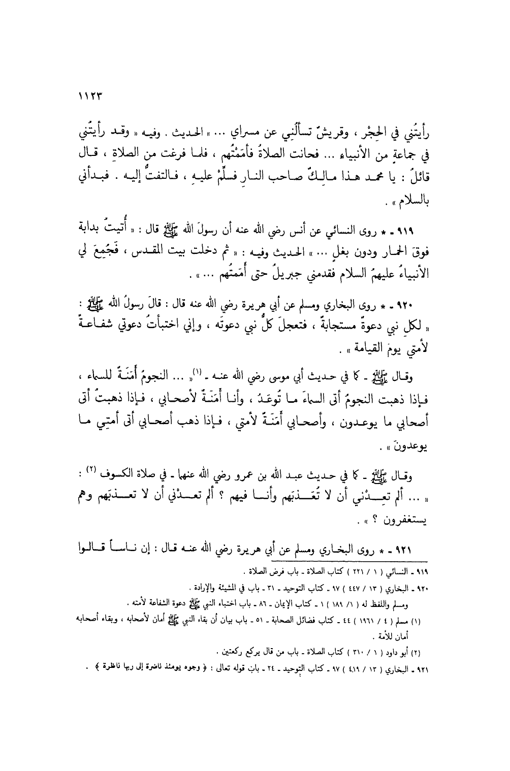 919 - * روى النسائي عن أنس رضي الله عنه أن رسول الله صلى الله عليه وسلم قال: "أُتيتُ بدابة فوق الحمار ودون بغلٍ ... " الحديث وفيه: "ثم دخلت بيت المقدس، فجُمِعَ لي الأنبياءُ عليهمُ السلام فقدمني جبريل حتى أممتُهم ... ".