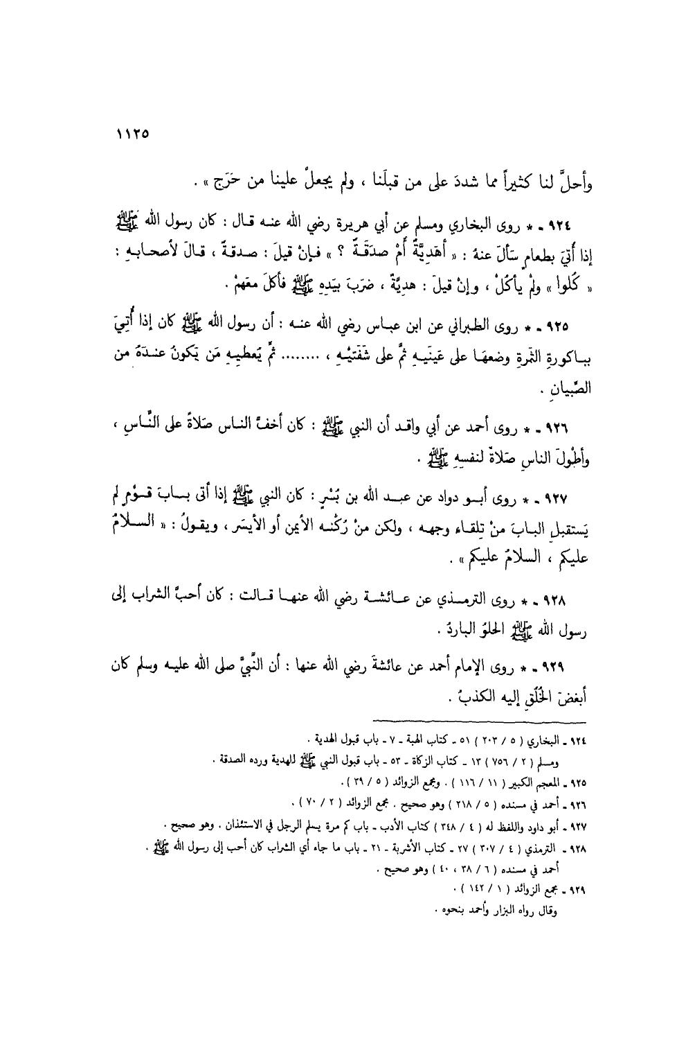924 - * روى البخاري وملم عن أبي هريرة رضي الله عنه قال: كان رسول الله صلى الله عليه وسلم إذا أُتي بطعامٍ سأل عنه: "أهديةً أم صدقة؟ " فإن قيل: صدقة، قال لأًحابه: "كُلوا" ولم يأكل، وإن قيل: هديةً، ضرب بيده صلى الله عليه وسلم فأكل معهم.