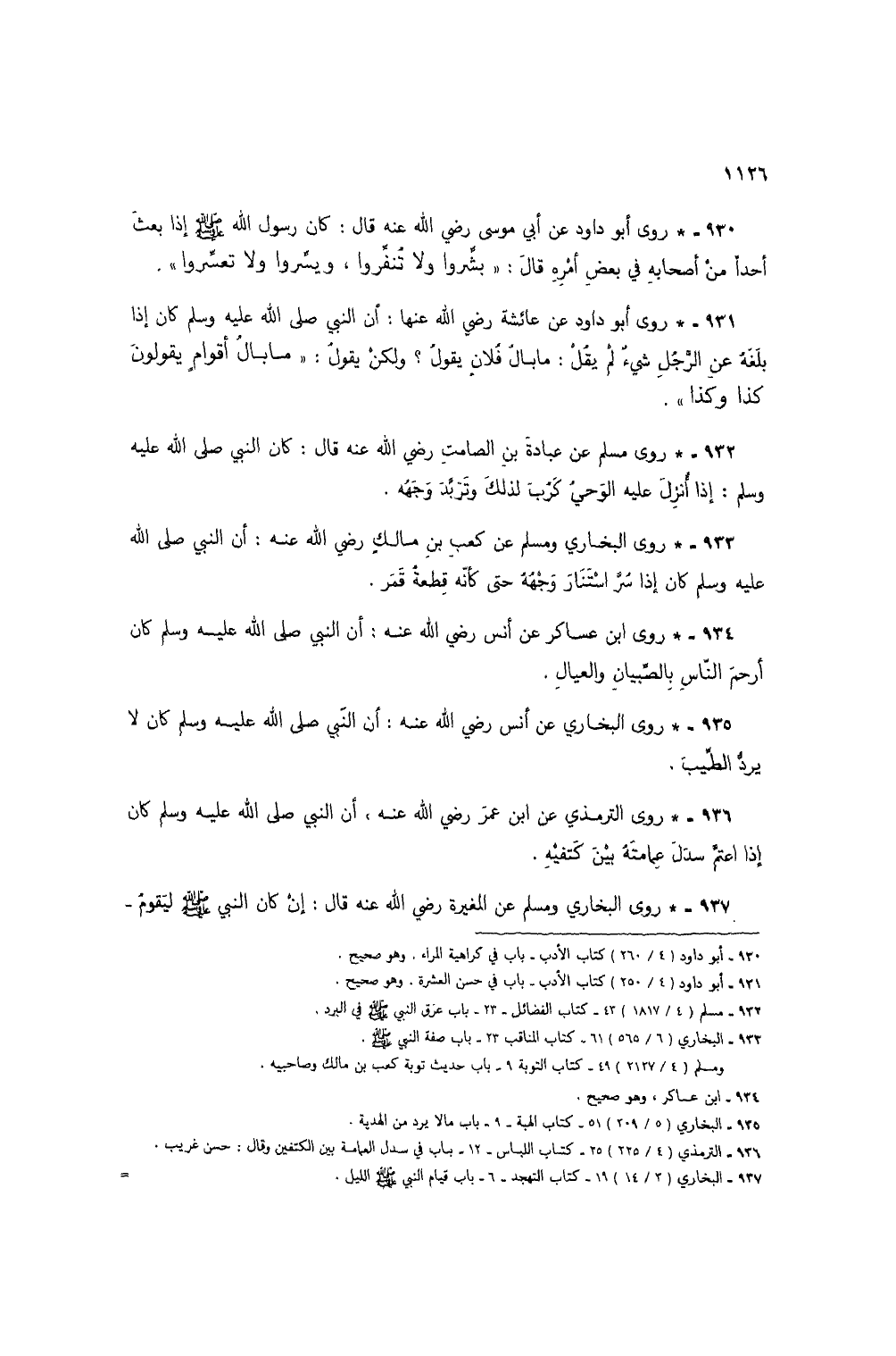 930 - * روى أبو داود عن أبي موسى رضي الله عنه قال: كان رسول الله صلى الله عليه وسلم إذا بعث أحداً من أصحابه في بعض أمره قال: "بشروا ولا تنفروا، ويسروا ولا تعسروا".