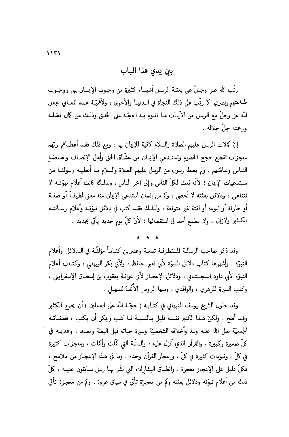 إن كمالات الرسل عليهم الصلاة والسلام كافية للإيمان بهم، ومع ذلك فقد أعطاهم ربهم معجزات تقطع حجج الخصوم وتستدعي الإيمان من عشاق الحق وأهل الإنصاف وخاصة الناس وعامتهم. ولم يعط رسول من الرسل عليهم الصلاة والسلام ما أعطيه رسولنا من مستدعيات الإيمان؛ لأنه بُعث لكل الناس وإلى آخر الناس، ولذلك كانت أعلام نبوته لا تتناهى، ودلائل بعثته لا تُحصى، وكم من إنسان استدعى الإيمان منه معنى لطيفاً أو صفة أو خارقة أو نبوءة أو لفتة غير متوقعة، ولذلك فقد كتب في دلائل نبوته وأعلام رسالته الكثير ولا زال، ولايطمع أحد في استقصائها؛ لأن كل يوم جديد يأتي بجديد.