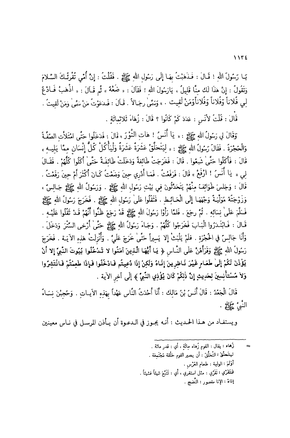 وقال لي رسول الله صلى الله عليه وسلم: "يا أنسُ! هات التور" قال: فدخلوا حتى امتلأت الصُفة والحجرة. فقال رسول الله صلى الله عليه وسلم: "ليتحلقُ عشرة عشرةٌ وليأكل كل إنسان مما يليه" قال: فأكلوا حتى شبعوا. قال: فخرجت طائفةً ودخلت طائفةً حتى أكلوا كلهم. فقال لي "يا أنس! ارفعْ" قال: فرفعتُ. فما أدري حين وضعتُ كان أكثر أم حين رفعتُ. قال: وجلس طوائف منهم يتحدثون في بيت رسول الله صلى الله عليه وسلم. ورسول الله صلى الله عليه وسلم جالسٌ، وزوجته موليةٌ وجهها إلى الحائط. فثقلوا على رسول الله صلى الله عليه وسلم. فخرج رسول الله صلى لله لعيه وسلم فسلم على نسائه. ثم رجع. فلما رأوا رسول الله صلى الله عليه وسلم قد رجع ظنوا أنهم قد ثقلوا عليه. قال: فابتدروا الباب فخرجوا كلهم. وجاء رسول الله صلى الله عليه وسلم حتى أرخى الستر ودخل. وأنا جالس في الحجرة. فلم يلبث إلا يسيراً حتى خرج عليّ. وأُنزلتْ هذه الآية. فخرج رسول الله صلى الله عليه وسلم وقرأهن على الناس {يَاأَيُّهَا الَّذِينَ آمَنُوا لَا تَدْخُلُوا بُيُوتَ النَّبِيِّ إِلَّا أَنْ يُؤْذَنَ لَكُمْ إِلَى طَعَامٍ غَيْرَ نَاظِرِينَ إِنَاهُ وَلَكِنْ إِذَا دُعِيتُمْ فَادْخُلُوا فَإِذَا طَعِمْتُمْ فَانْتَشِرُوا وَلَا مُسْتَأْنِسِينَ لِحَدِيثٍ إِنَّ ذَلِكُمْ كَانَ يُؤْذِي النَّبِيَّ} إلى آخر الآية.