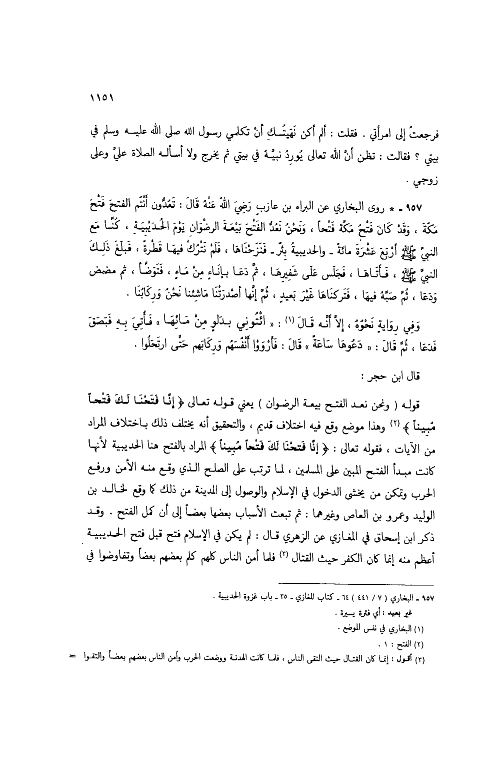 قوله (ونحن نعد الفتح بيعة الرضوان) يعني قوله تعالى {إِنَّا فَتَحْنَا لَكَ فَتْحًا مُبِينًا} (2) وهذا موضع وقع فيه اختلاف قديم، والتحقيق أنه يختلف ذلك باختلاف المراد من الآيات، فقوله تعالى: {إِنَّا فَتَحْنَا لَكَ فَتْحًا مُبِينًا} المراد بالفتح هنا الحديبية لأنها كانت مبدأ الفتح المبين على المسلمين، لما ترتب على الصلح الذي وقع منه الأمن ورفع الحرب وتمكن من يخشى الدخول في الإسلام والوصول إلى المدينة من ذلك كما وقع لخالد بن الوليد وعمرو بن العاص وغيرهما: ثم تبعت الأسباب بعضها بعضاً إلى أن كمل الفتح. وقد ذكر ابن إسحاق في المغازي عن الزهري قال: لم يكن في الإسلام فتح قبل فتح الحديبية أعظم منه إنما كان الكفر حيث القتال (3) فلما أمن الناس كلهم كلم بعضهم بعضاً وتفاوضوا في