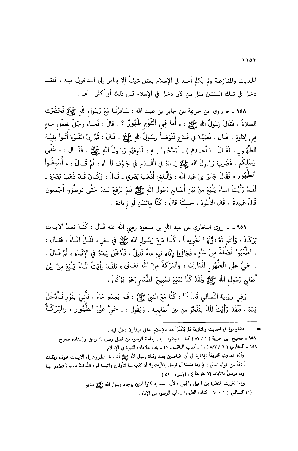 958 - * روى ابن خزيمة عن جابر بن عبد الله: سافرنا مع رسول الله صلى الله عليه وسلم فحضرتِ الصلاة، فقال رسول الله صلى الله عليه وسلم: "أما في القوم طهورٌ؟ " قال: فجاء رجل بفضل ماء في إداوةٍ. قال: فصبهُ في قدح فتوضأ رسول الله صلى الله عليه وسلم. قال: ثم إن القوم أتوا بقية الطهور. فقال- (أحدهم) - تمسحُوا به، فسمعهم رسول الله صلى الله عليه وسلم. فقال: "على رسلكم" فضرب رسول الله صلى الله عليه وسلم يده في القدح في جوف الماء، ثم قال: "أسبغُوا الطهُور" فقال جابر بن عبد الله: والذي أذهب بصري - قال: وكان قد ذهب بصره- لقد رأيت الماء ينبعُ من بين أصابع رسول الله صلى الله عليه وسلم فلم يرفع يده حتى توضؤوا أجمعُون قال عبيدة، قال الأسود، حسبتُهُ قال: كنا مائتين أو زيادة.