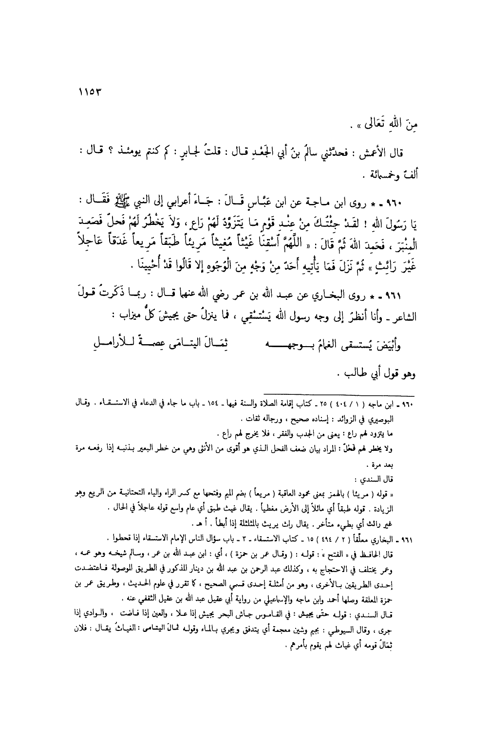 961 - * روى البخاري عن عبد الله بن عمر رضي الله عنهما قال: ربما ذكرتُ قول الشاعر- وأنا أنظرُ إلى وجه رسول الله يستسقي" فما ينزلُ حتى يجيش كل ميزاب: