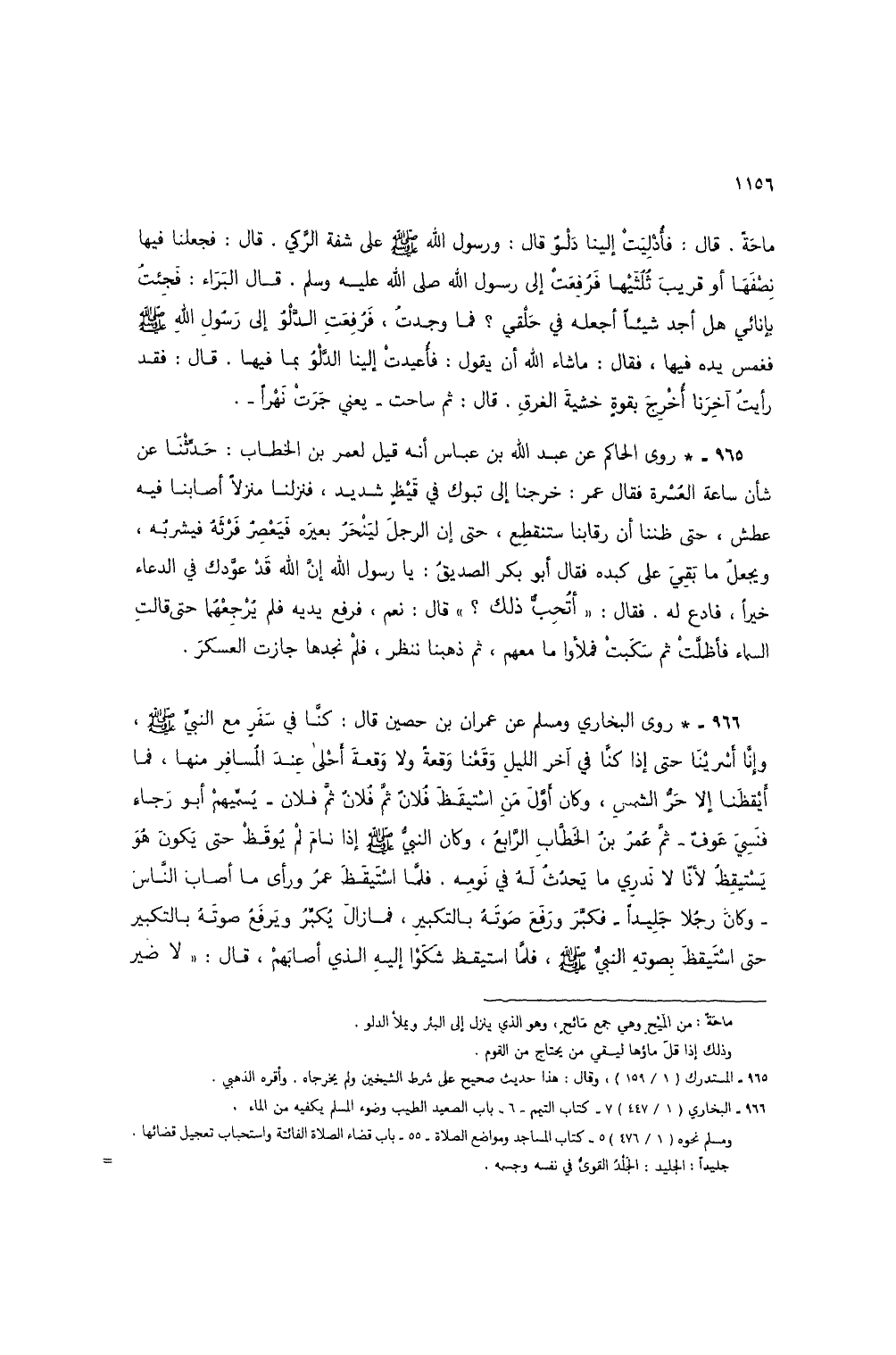 966 - * روى البخاري ومسلم عن عمران بن حصين قال: كنا في سفر مع النبي صلى الله عليه وسلم وإنا أشريْنا حتى إذا كنا في آخر الليل وقعنا وقعة ولا وقعة أحلى عند المسافر منها، فما أيقظنا إلا حر الشمس، وكان أول من استيقظ فلان ثم فلان ثم فلان - يسميهم أبو رجاء فنسي عوفٌ- ثم عمر بن الخطاب الرابع، وكان النبي صلى الله عليه وسلم إذا نام لم يُوقَظْ حتى يكون هو نستيقظ لأنا لا ندري ما يحدث له في نومه. فلما استيقظ عمر ورأى ما أصاب الناس - وكان رجلاً جليداً - فكبَّرَ ورفع صوته بالتكبير، فما زال يُكبِّرُ ويرفع صوته بالتكبير حتى استيقظ بصوته النبي صلى الله عليه وسلم، فلما استيقظ شكوا إليه الذي أصابهم، قال (1): "لا ضير