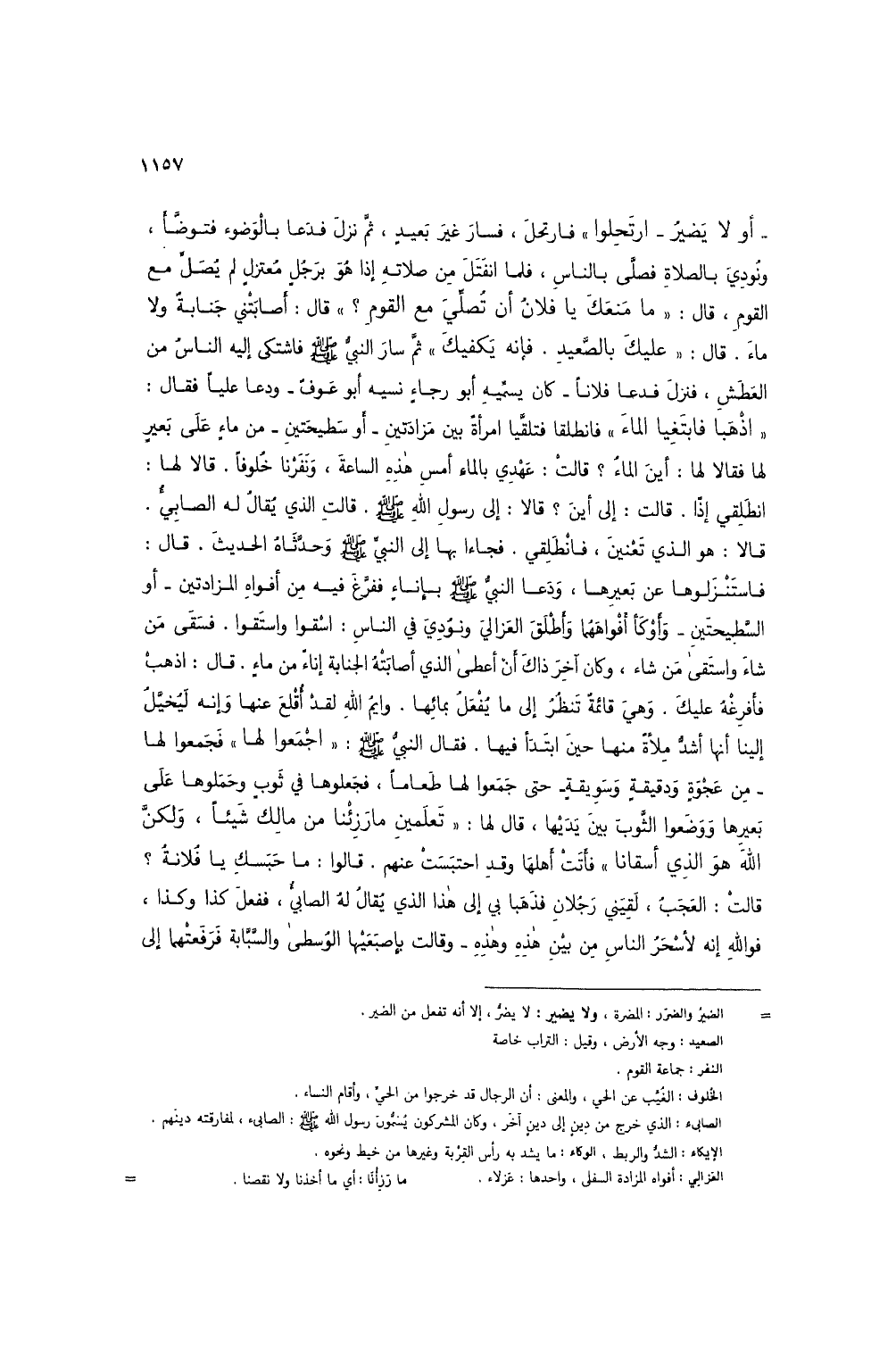 - أو لا يضيرُ - ارتحِلوا" فارتحل، فسار غير بعيدٍ، ثم نزل فدعا بالوضوء فتوضأ، ونُودِيَ بالصلاة فصلى بالناس، فلما انفتل من صلاته إذا هو برجلٍ معتزلٍ لم يُصلِّ مع القوم، قال: "ما منعك يا فلان أن تُصلي مع القوم؟ " قال: أصابتني جنابةٌ ولا ماء. قال: "عليك بالصعيد. فإنه يكفيك" ثم سار النبي صلى الله عليه وسلم فاشتكى إليه الناس من العطش، فنزل فدعا فلاناً - كان يسميه أبو رجاءٍ نسيه أبو عوفٌ- ودعا علياً فقال: "اذهبا فابتغيا الماء" فانطلقا فتلقيا امرأة بين مزادتين - أو سطيحتين - من ماء على بعيرٍ لها فقالا لها: أين الماءُ؟ قالت: عهدي بالماء أمس هذه الساعة، ونفرنا خُلوفاً. قالا لها: انطلقي إذاً. قالت: إلى أين؟ قالا: إلى رسول الله صلى الله عليه وسلم. قالت الذي يُقال له الصابئُّ. قالا: هو الذي تعنين، فانطلقي. فجاءا بها إلى النبي صلى الله عليه وسلم وحدثاهُ الحديث. قال: فاستنزلوها عن بعيرها، ودع النبي صلى الله عليه وسلم بإناء ففرَّغَ فيه من أفواه المزادتين - أو السطيحتين - وأوكأ أفواههُما وأطلق العزالي ونُودي في الناس: اسقوا واستقوا. فسقى من شاء واستقى من شاء، وكان آخر ذاك أن أعطى الذي أصابته الجنابة إناءً من ماءٍ. قال: اذهب فأفرغه عليك. وهي قائمة تنظرُ إلى ما يُفْعَلُ بمائها. وايمُ الله لقد أُقْلعَ عنها وإنه ليُخيَّلُ إلينا أنها أشدُّ ملأةُ منها حين ابتدأ فيها. فقال النبي صلى الله عليه وسلم: "اجمعوا لها" فجمعوا لها - من عجوةٍ ودقيقةٍ وسويقةٍ- حتى جمعوا لها طعاماً، فجعلوها في ثوبٍ وحملوها على بعيرها ووضعوا الثوب بين يديها، قال لها: "تعلمين ما رزِئْنا من مالك شيئاً، ولكن الله هو الذي أسقانا" فأتتْ أهلها وقد احتبسَتْ عنهم. قالوا: ما حَبَسكِ يا فُلانةُ؟ قالت: العجبُ، لقيني رجلان فذهبا بي إلى هذا الذي يقالُ له الصابئُّ، ففعل كذا وكذا، فوالله إنه لأسحرُ الناس من بين هذه وهذه (1) - وقالت بإصبعيْها الوُسطى والسبابة فرفعتهما إلى