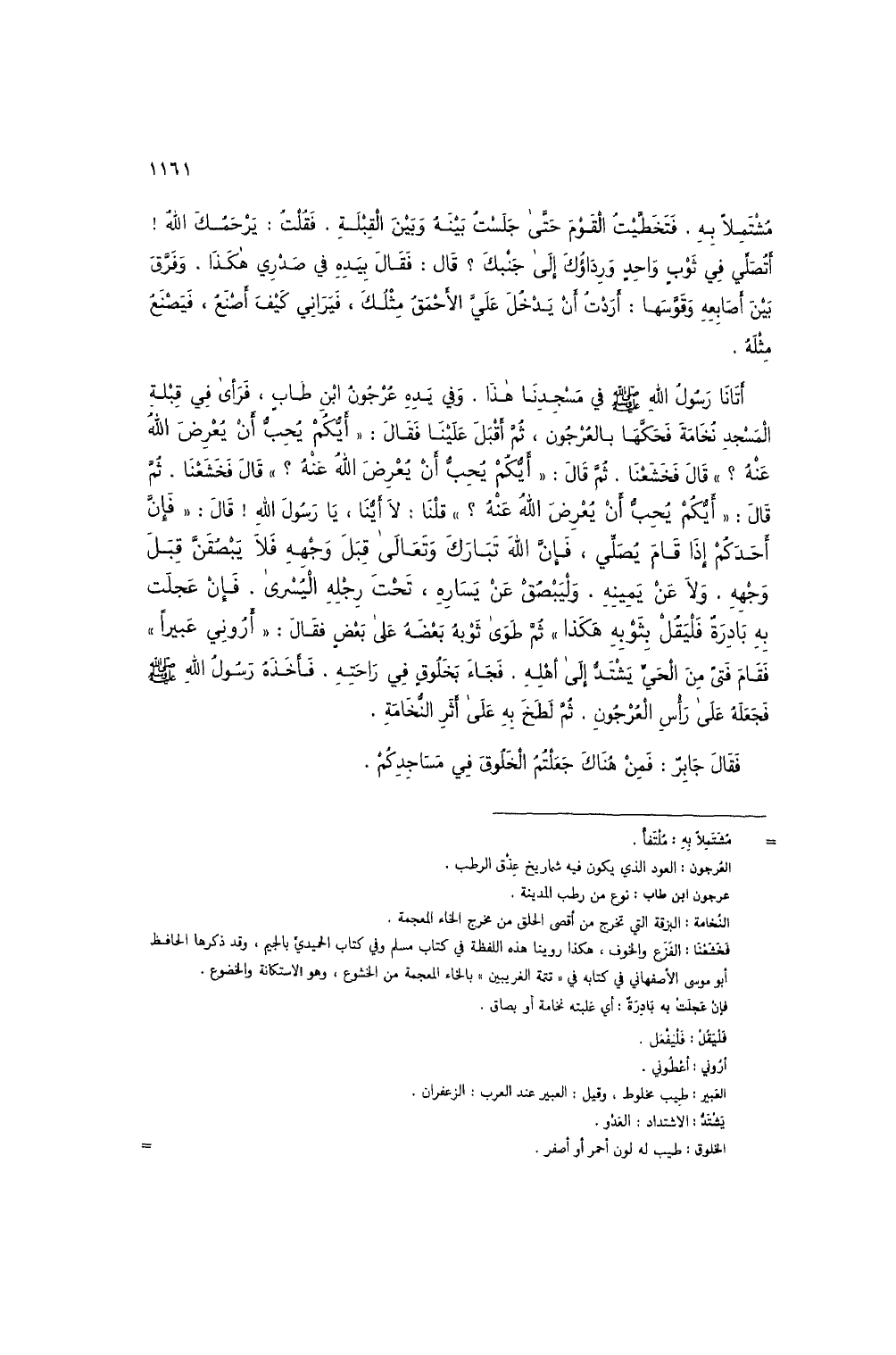 أتانا رسول الله صلى الله عليه وسلم في مسجدنا هذا، وفي يده عرجون ابن طابٍ، فرأى في قبلة المسجد نُخامة فحكها بالعرجون، ثم أقبل علينا فقال: "أيكم يُحبُّ أن يُعْرِض الله عنه؟ " قال فخشعنا. ثم قال: "أيكُمْ يُحبُّ أن يُعْرِض الله عنه؟ " قال فخشعنا. ثم قال: "أيُّكُم يُحبُّ أن يُعْرِض الله عنه؟ " قلنا: لا أينا، يا رسول الله! قا: "فإن أحدكم إذا قام يُصلي، فإن الله تبارك وتعلى قِبَلَ وجهه فلا يَبْصُقَنَّ قِبَلَ وجهه. ولا عن يمينه. وليبصُق عن يساره، تحت رجله اليُسْرى. فإن عجلت به بادرة فليقل بثوبه هكذا" ثم طوى ثوبه بعضه على بعضٍ فقال: "أرثوني عبيراً" فقام فتى من الحي يشتد إلى أهله. فجاء بخلوقٍ في راحتِه. فأخذه رسول الله صلى الله عليه وسلم فجعله على رأس العُرْجُونِ. ثم لطخَ به على أثر النُّخامة.