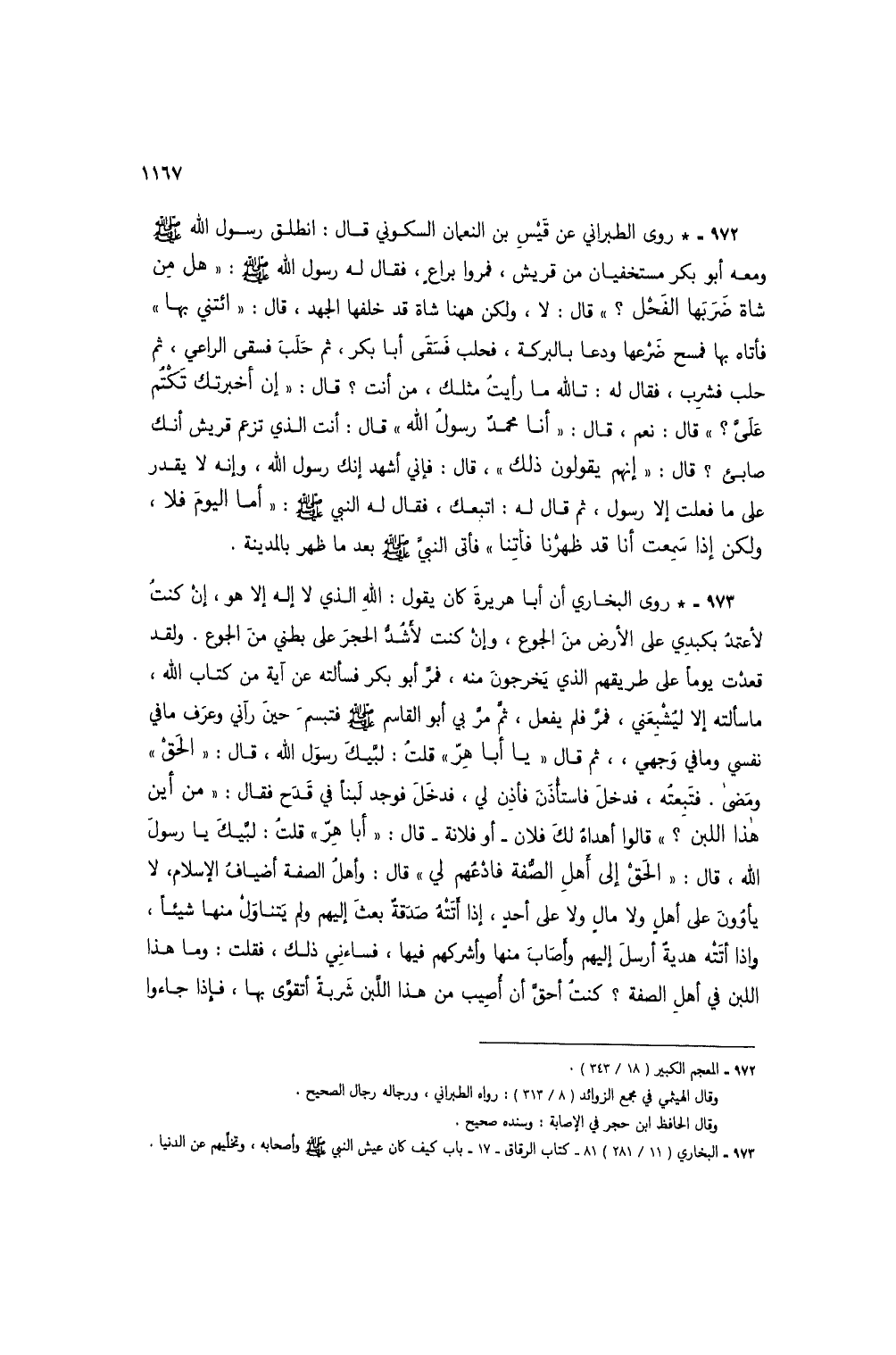 972 - * روى الطبراني عن قيس بن النعمان السكوني قال: انطلق رسول الله صلى الله عليه وسلم ومعه أبو بكر مستخفيان من قريش، فمروا براعٍ، فقال له رسول الله صلى الله عليه وسلم: "هل من شاة ضربها الفحْل؟ " قال: لا، ولكن ههنا شاة قد خلفها الجهد، قال: "ائتني بها" فأتاه بها فمسح ضرعها ودعا بالبركة، فحلب فسقى أبا بكر، ثم حلب فسقى الراعي، ثم حلب فشرب، فقال له: تالله ما رأيتُ مثلك، من أنت؟ قال: "إن أخبرتك تكْتُم عليَّ؟ " قال: نعم، قال: "أنا محمدٌ رسول الله" قال: أنت الذي تزعم قريش أنك صابئ؟ قال: "إنهم يقولون ذلك"، قال: فإني أشهد إنك رسول الله، وإنه لا يقدر على ما فعلت إلا رسول، ثم قال له: اتبعك، فقال له النبي صلى الله عليه وسلم: "أما اليوم فلا، ولكن إذا سمعت أنا قد ظهرنا فأتنا" فأتى النبيُ صلى الله عليه وسلم بعد ما ظهر بالمدينة.