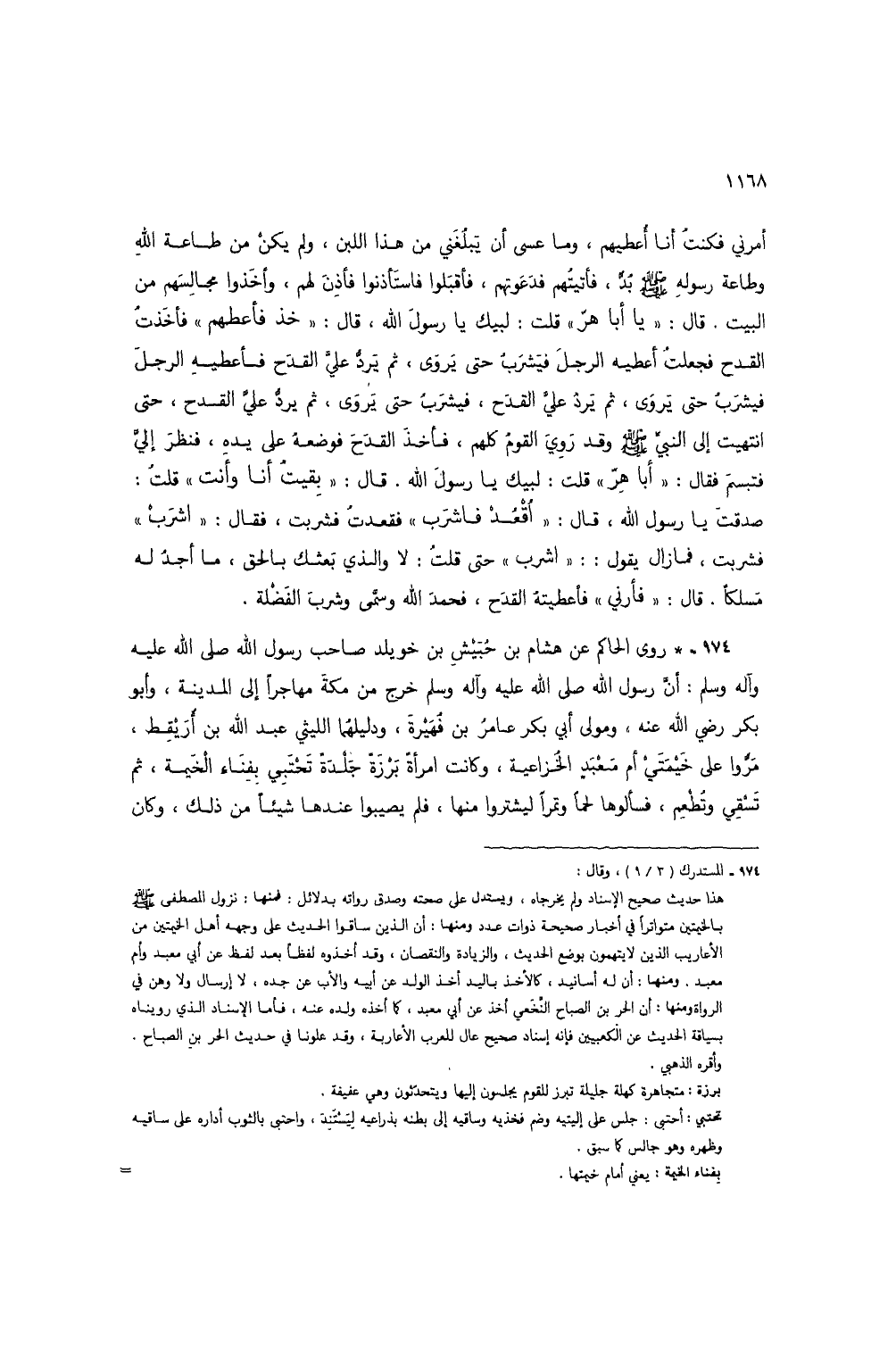 974 - * روى الحاكم عن هشام بن حُبيش بن خويلد صاحب رسول الله صلى الله عليه وآله وسلم: أن رسول الله صلى الله عليه وآله وسلم خرج من مكة مهاجراً إلى المدينة، وأبو بكر رضي الله عنه، ومولى أبي بكر عامرُ بن فُهيرة، ودليلهما الليثي عبد الله بن أريقط، مرُّوا على خيمتيْ أم سعيدٍ الخزاعية، وكانت امرأة برزة جلدة تحتبي بفناء الخيمة، ثم تسقي وتطعم، فسألوها لحماً وتمراً ليشتروا منها، فلم يصيبوا عندها شيئاً من ذلك (1)، وكان