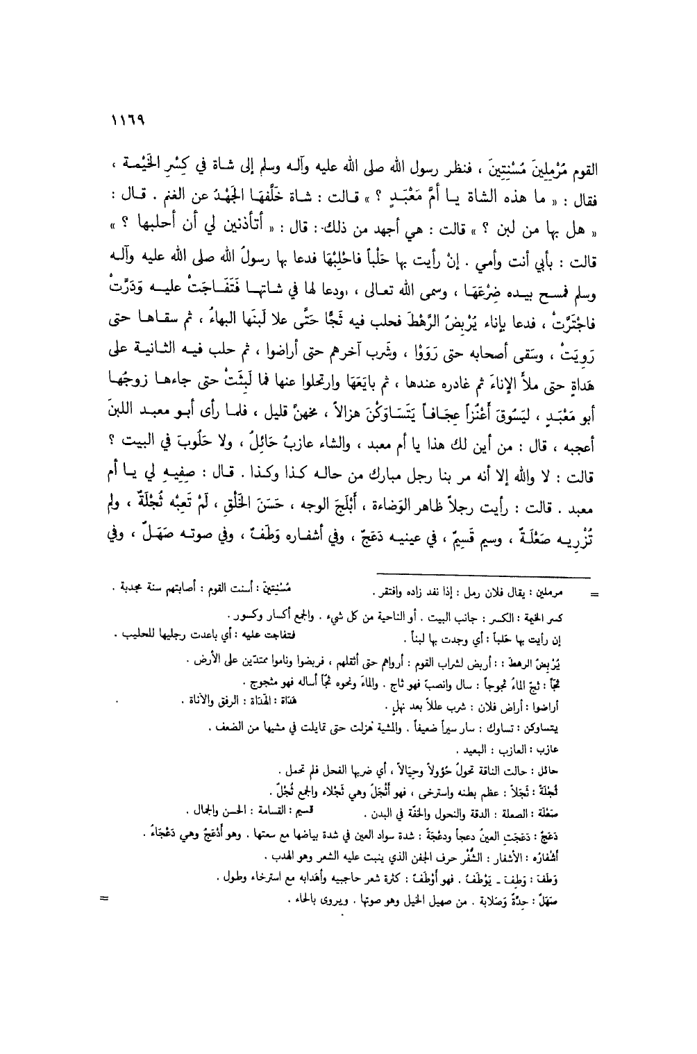 القوم مرملين مسنتين، فنظر رسول الله صلى الله عليه وآله وسلم إلى شاة في كسر الخيمة، فقال: "ما هذه الشاة يا أم معبدٍ؟ " قالت: شاة خلفها الجهدُ عن الغنم. قال: "هل بها من لبن؟ " قالت: هي أجهد من ذلك: قال: "أتأذنين لي أن أحلبها؟ " قالت: بأبي أنت وأمي. إنْ رأيت بها حلباً فاحلبْها فدعا بها رسول الله صلى الله عليه وآله وسلم فمسح بيده ضرعها، وسمى الله تعالى، ودعا لها في شاتها فتفاجتْ عليه درتْ فاجترتْ، فدعا بإناء يُرْبِض الرهْطَ فحلب فيه ثَجًّا حتى علا لبنها البهاءُ، ثم سقاها حتى زويتْ، وسقى أصحابه حتى رووا، وشرب آخرهم حتى أراضوا، ثم حلب فيه الثانية على هداةٍ حتى ملأ الإناء ثم غادره عندها، ثم بايعها وارتحلوا عنها فما لبثتْ حتى جاءها زوجُها أبو معبدٍ، ليسوق أعنزاً عجافاً يتساوكْنَ هزالاً، مخهنِّ قليل، فلما رأى أبو معبد اللين أعجبه، قال: من أين لك هذا يا أم معبد، والشاء عازبُ حائلُ، ولا حلوب في البيت؟ قلت: لا والله إلا أنه مر بنا رجل مبارك من حاله كذا وكذا. قال: صفيه لي يا أم معبد. قالت: رأيت رجلاً ظاهر الوضاءة، أبلج الوجه، حسن الخَلْق، لم تعبْه ثُجْلَةٌ، ولم تُزريه صعلةً، وسيم قسيمٌ، في عينيه دعجٌ، وفي أشفاره وطفٌ، وفي صوته صهلٌ (1)، وفي