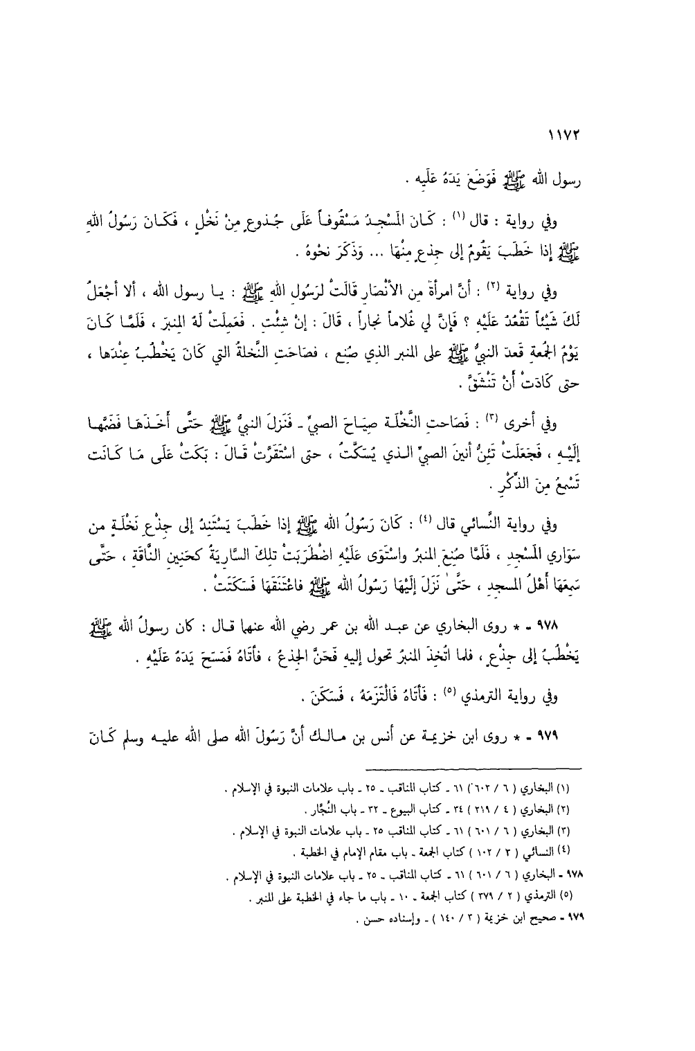 978 - * روى البخاري عن عبد الله بن عمر رضي الله عنهما قال: كان رسول الله صلى الله عليه وسلم يخطبُ إلى جذعٍ، فلما اتخذ المنبر تحول إليه فحنَّ الجذعُ، فأتاهُ فمسح يده عليه.
