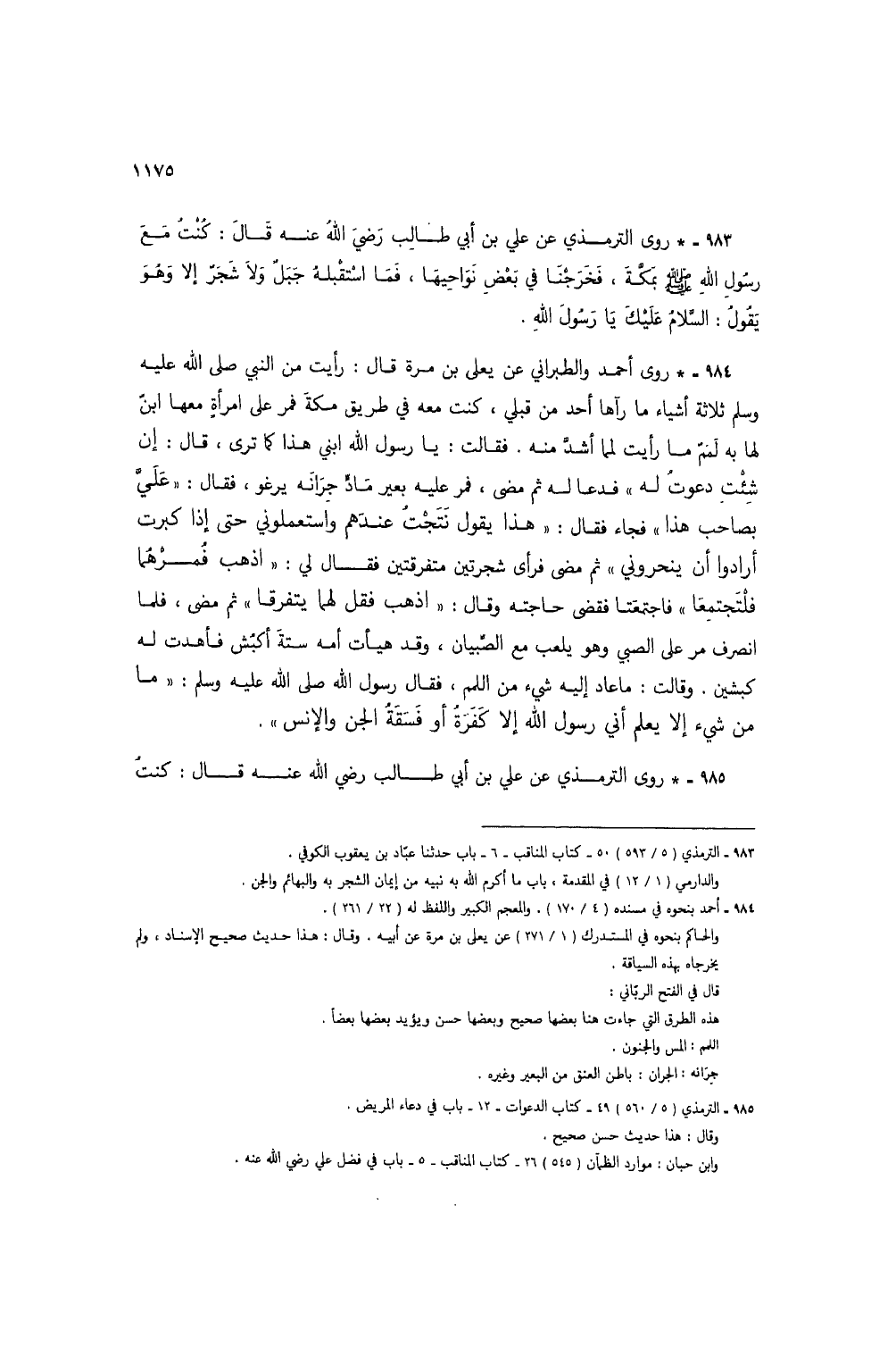 983 - * روى الترمذي عن علي بن أبي طالب رضي الله عنه قال: كنتُ مع رسول الله صلى الله عليه وسلم بمكة، فخرجنا في بعض نواحيها، فما استقبلهُ جبلٌ ولا شجرٌ إلا وهو يقول: السلامُ عليك يا رسول الله.