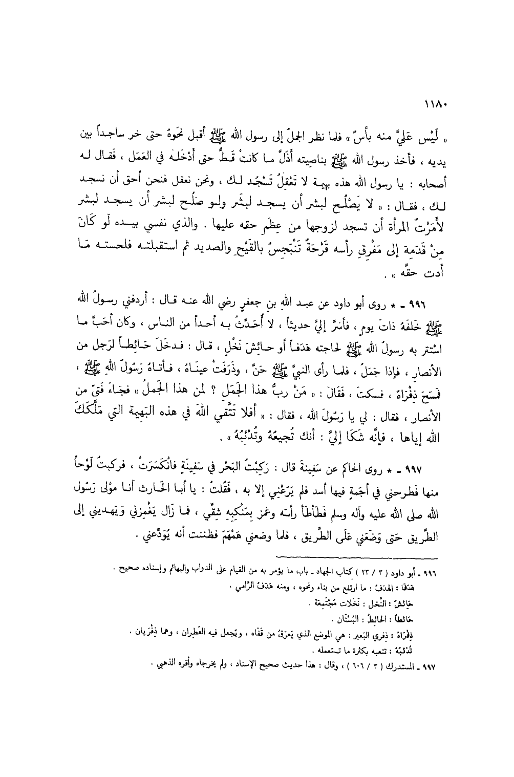 996 - * روى أبو داود عن عبد الله بن جعفر رضي الله عنه قال: أردفني رسول الله صلى الله عليه وسلم خلفه ذات يومٍ، فأسر إليَّ حديثاً، لا أُحدثُ به أحداً من الناس، وكان أحب ما استتر به رسول الله صلى الله عليه وسلم لحاجته هدفاً أو حائش نخلٍ، قال: فدخل حائطاً لرجل من الأنصار، فإذا جملُ، فلما رأى النبي صلى الله عليه وسلم حَنَّ، وذرفتْ عيناهُ، فأتاه رسول الله صلى الله عليه وسلم، فمسح ذِفْراهُ، فسكت، فقال: "من ربُّ هذا الجمل؟ لمن هذا الجملُ" فجاء فتى من الأنصار، فقال: لي يا رسول الله، فقال: "أفلا تتقي الله في هذه البهيمة التي ملكك الله إياها، فإنه شكا إليَّ: أنك تُجيعُهُ وتُدْيّبُهُ".
