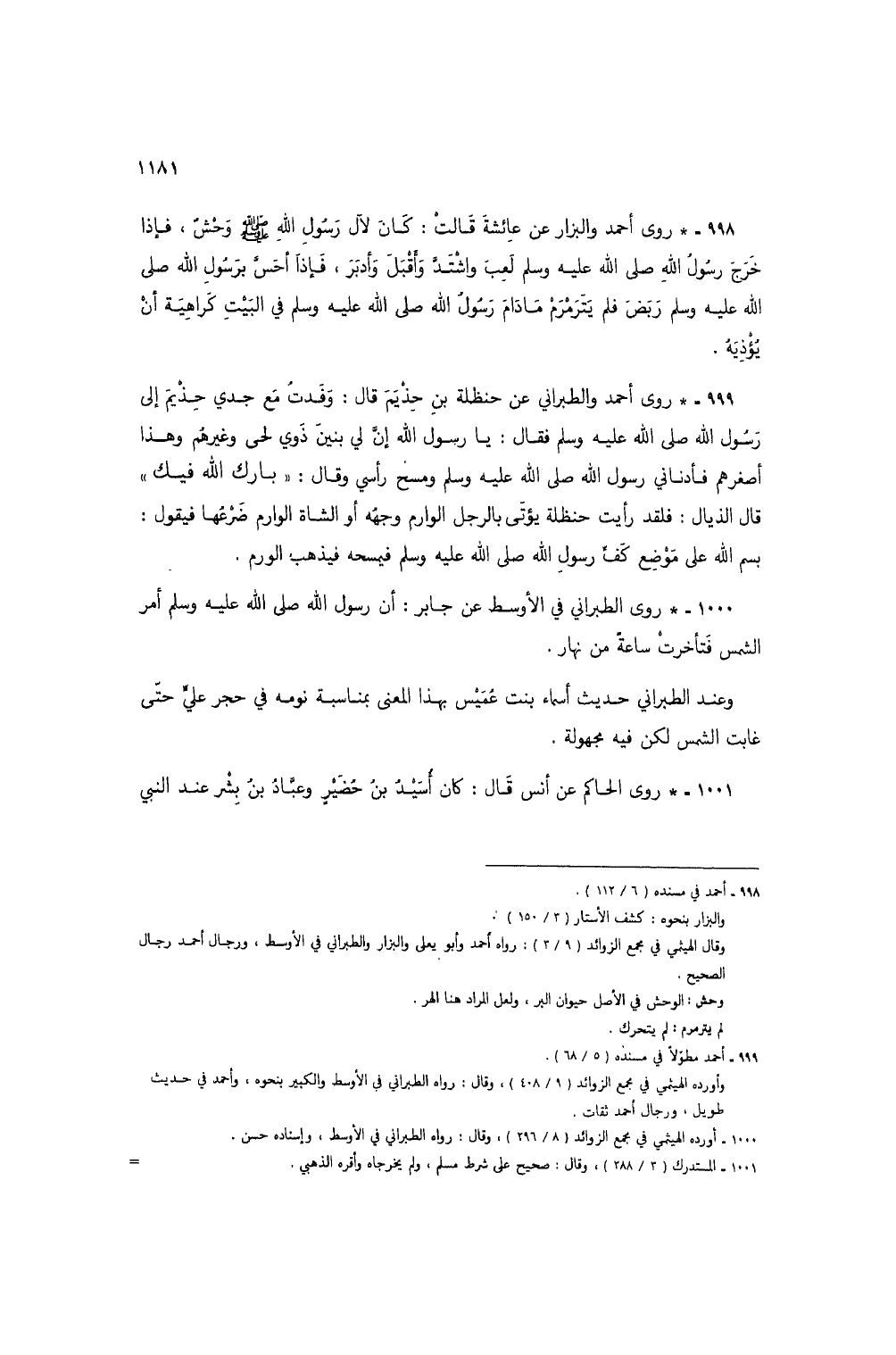 999 - * روى أحمد والطبراني عن حنظلة بن حِذْيَم قال: وفدتُ مع جدي حِذْيم إلى رسول الله صلى الله عليه وسلم فقال: يا رسول الله إن لي بنين ذوي لحى وغيرهم وهذا أصغرهم فأدناني رسول الله صلى الله عليه وسلم ومسح رأسي قوال: "بارك الله فيك" قال الذيال: فلقد رأيت حنظلة يؤتي بالرجل الوارم وجهه أو الشاة الوارم ضرعها فيقول: بسم الله على موضع كف رسول الله صلى الله عليه وسلم فيمسحه فيذهب الورم.