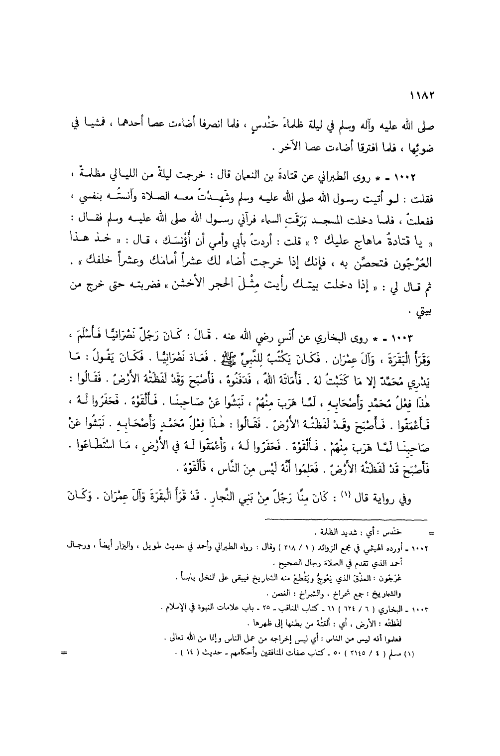 1002 - * روى الطبراني عن قتادة بن النعمان قال: خرجت ليلة من الليالي مظلمة، فقلت: لو أتيت رسول الله صلى الله عليه وسلم وشهدت معه الصلاة وآنستُه بنفسي، ففعلتُ، فلما دخلت المسجد برقتِ السماء فرآني رسول الله صلى الله عليه وسلم فقال: "يا قتادة ما هاج عليك؟ " قلت: أردتُ بأبي وأمي أن أؤنسك، قال: "خذ هذا العرجون فتحصن به، فإنك إذا خرجت أضاء لك عشراً أمامك وعشراً خلفك". ثم قال لي: "إذا دخلت بيتك رأيت مثل الحجر الأخشن" فضربته حتى خرج من بيتي.