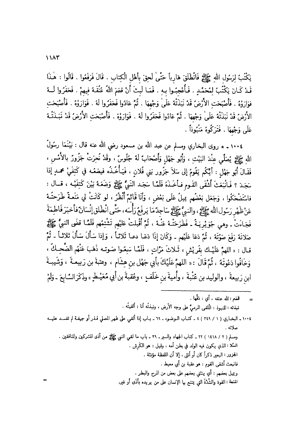 1004 - * روى البخاري ومسلم عن عبد الله بن مسعود رضي الله عنه قال: بينما رسول الله صلى الله عليه وسلم يُصلي عند البيت، وأبو جهلٍ وأصحاب له جلوسٌ، وقد نُحِرَتْ جزُورٌ بالأمس، فقال أبو جهل: أيكم يقوم إلى سلا جزور بني فلان، فيأخذه فيضعه في كتفي محمدٍ إذا سجد؟ فانبعث أشقى القوم فأخذه فلما سجد النبي صلى الله عليه وسلم وضعه بين كتفيه، قال: فاستضحكوا، وةجعل بعضهم يميلُ على بعضٍ، وأنا قائم أنظرُ، لو كانت لي منعةُ طرحتُه عن ظهر رسول الله صلى الله عليه وسلم، والنبي صلى الله عليه وسلم ساجدٌ ما يرفعُ رأسه، حتى انطلق إنسان فأخبر فاطمة فجاءت - وهي جويريةُ - فطرحتهُ عنه، ثم أقبلتْ عليهم تشتمُهم فلما قضى النبي صلى الله عليه وسلم صلاته رفع صوتهُ، ثم دعا عليهم - وكان إذا دَعَا دعا ثلاثاً، وإذا سأل سأل ثلاثاً - ثم قال: "اللهم عليك بقريشٍ" ثلاث مراتٍ، فلما سمعوا صوته ذهب عنهم الضحكُ، وخافوا دعوته، ثم قال: "اللهم عليك بأبي جهل بن هشام، وعتبة بن ربيعة، وشيبة ابن ربيعة، والوليد بن عتبة، وأمية بن خلف وعقبة بن أبي مُعيط" وذكر السابع - (1) ولمْ