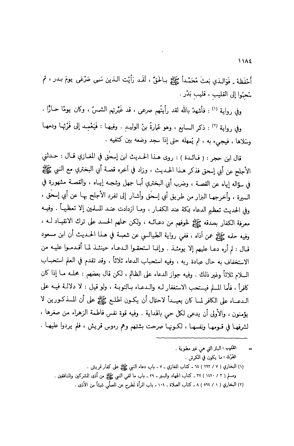 قال ابن حجر: (فائدة): روى هذا الحديث ابن إسحق في المغازي قال: حدثني الأجلح عن أبي إسحق فذكر هذا الحديث، وزاد في آخره قصة أبي البختري مع النبي صلى الله عليه وسلم في سؤاله إياه عن القصة، وضرب أبي البختري أبا جهل وشجه إياهن والقصة مشهورة في السيرة، وأخرجها البزار من طريق أبي إسحق وأشار إل تفرد الأجلح بها عن أبي إسحق، وفي الحديث تعظيم الدعاء بمكة عند الكفار، وما ازدادت عند المسلمين إلا تعظيماً. وفيه معرفة الكفار بصدقه صلى الله عليه وسلم لخوفهم من دعائه، ولكن حملهم الحسد على ترك الانقياد له، وفيه حلمه صلى الله عليه وسلم عمن آذاه، ففي رواية الطيالسي عن شعبة في هذا الحديث أن ابن مسعود قال: لم أره دعا عليهم إلا يومئذ. وإنما استحقوا الدعاء حينئذ لما أقدموا عليه من الاستخفاف به حال عبادة ربه، وفيه استحباب الدعاء ثلاثاً، وقد تقدم في العلم استحباب السلام ثلاثاً وغير ذلك. وفيه جواز الدعاء على الظالم، لكن قال بعضهم: محله ما إذا كان كافراً، فأما المسلم فيستحب الاستغفار له والدعاء بالتوبة، ولو قيل: لا دلالة فيه على الدعاء على الكافر لما كان بعيداً لاحتمال أن يكون اطلع صلى الله عليه وسلم على أن المذكورين لا يؤمنون، والأولى أن يدعي لكل حي بالهداية. وفيه قوة نفس فاطمة الزهراء من صغرها، لشرفها في قومها ونفسها، لكونها صرحت بشتمهم وهم رءوس قريش، فلم يردوا عليها.