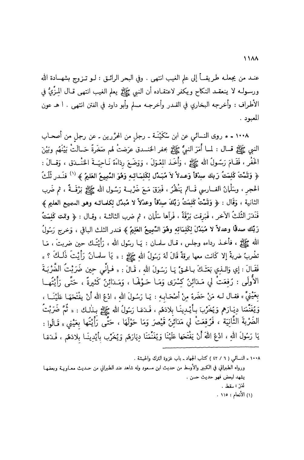 1008 - * روى النسائي عن ابن سُكيْنَة - رجلٍ من المحررين - عن رجلٍ من أصحاب النبي صلى الله عليه وسلم قال: لما أمر النبي صلى الله عليه وسلم بحفر الخندق عرضت لهم صخرة حلت بينهم وبين الحفر، فقام رسول الله صلى الله عليه وسلم، وأخذ المِعْوَلَ، ووضع رداءَهُ ناحية الخندق، وقال: {وَتَمَّتْ كَلِمَتُ رَبِّكَ صِدْقًا وَعَدْلًا لَا مُبَدِّلَ لِكَلِمَاتِهِ وَهُوَ السَّمِيعُ الْعَلِيمُ} (1) فندر ثُلُُُ الحجرِ، وسلمان الفارسي قائم ينظرُ، فبرق مع ضربة رسول الله صلى الله عليه وسلم برقةُ، ثم ضرب الثانية، وقال: {وَتَمَّتْ كَلِمَتُ رَبِّكَ صِدْقًا وَعَدْلًا لَا مُبَدِّلَ لِكَلِمَاتِهِ وَهُوَ السَّمِيعُ الْعَلِيمُ} فندر الثلث الآخر، فبرقت برقةً، فرآها سلمان، ثم ضرب الثالثة، وقال: {وَتَمَّتْ كَلِمَتُ رَبِّكَ صِدْقًا وَعَدْلًا لَا مُبَدِّلَ لِكَلِمَاتِهِ وَهُوَ السَّمِيعُ الْعَلِيمُ} فندر الثلث الباقي، وخرج رسولُ الله صلى الله عليه وسلم، فأخذ رداءه وجلس، قال سلمان: يا رسول الله، رأيتُك حين ضربت، ما تضربُ ضربة إلا كانت معها برقة قال له رسول الله صلى الله عليه وسلم: "يا سلمانُ رأيت ذلك؟ " فقال: إي والذي بعثك بالحق يا رسول الله، قال: "فإني حين ضربتُ الضربة الأولى: رُفعت لي مدائنُ كسرى وما حولها، ومدائنُ كثيرة، حتى رأيتُها بعيني" فقال له من حضرهُ من أصحابه: يا رسول الله، ادع الله أنْ يفتحها علينا، ويُغنمنا ديارهم ويُخرب بأيدينا بلادهُم، فدعا رسول الله صلى الله عليه وسلم بذلك: "ثُمَّ ضربتُ الضربة الثانية، فرُفِعتْ لي مدائنُ قيصر وما حولها، حتى رأيتُها بعيني" قالوا: يا رسول الله، ادعُ الله أن يفتحها علينا ويُغنمنا ديارهُم ويُخرب بأيدينا بلادهُم، فدعا