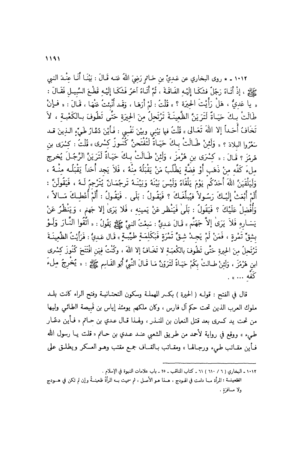 1012 - * روى البخار يعن عدي بن حاتم رضي الله عنه قال: بينا أنا عند النبي صلى الله عليه وسلم، إذ أتاه رجل فشكا إليه الفاقة، ثم أتاه آخر فشكا إليه قطع السبيل فقال: "يا عديُّ، هل رأيت الحيرة؟ " قلتُ: لم أرها، وقد أنبئت عنها، قال: "فإنْ طالت بك حياةٌ لترين الظعينة ترتحلُ من الحيرة حتى تطوف بالكعبة، لا تخافُ أحداً إلا الله تعالى" قلتُ فيما بيني وبين نفسي: فأين دُعَّارُ طيء الذين قد سعروا البلاد؟ " ولئنْ طالتْ بك حياة لتفتحن كنوزُ كسرى" قلت: كسرى بن هُرمز؟ قال: "كسرى بن هرمز، ولئن طالت بك حياة لترين الرجل يُخرج ملء كفه من ذهب أو فضة يطلبُ من يقبله منه، فلا يجد أحداً يقبله منه، وليلقين الله أحدكم يوم يلقاه وليس بينه وبينه ترجُمان يُتَرْجِمُ له، فيقولن: ألم أبعث إليك رسولاً فيُبلغك؟ فيقول: بلى. فيقول: ألم أُعطك مالاً، وأُفْضِلْ عليك؟ فيقول: بلى فينظر عن يمينه، فلا يرى إلا جهنم، وينظرُ عن يساره فلا يرى إلا جهنم" قال عدي: سمعتُ النبي صلى الله عليه وسلم يقول: "اتقوا النار ولو بشق تمرة، فمن لم يجد شق تمرة فبكلمة طيبة" قال عدي: فرأيتُ الظعينة ترتحلُ من الحيرة حتى تطوف بالكعبة لا تخاف إلا الله، وكنت فيمن افتتح كنُوز كِسرى ابن هُرمز، ولئن طالت بكم حياة لترون ما قال النبي أبو القاسم صلى الله عليه وسلم: "يُخرج ملء كفه ... ".