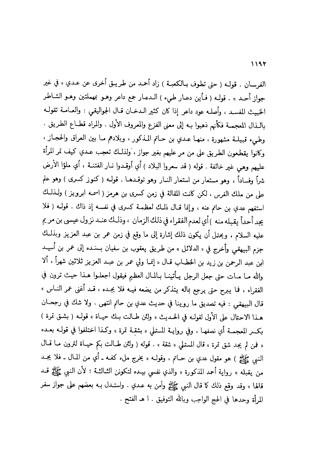 الفرسان. قوله (حتى تطوف بالكعبة) زاد أحمد من طريق أخرى عن عدي "في غير جواز أحد". قوله (فأين دعار طيء) الدعار جمع داعر وهو بمهملتين وهو الشاطر الخبيث المفسد، وأصله عود داعر إذا كان كثير الدخان قال الجواليقي: والعامة تقوله بالذال المعجمة فكأنهم ذهبوا به إلى معنى الفزع والمعروف الأول. والمراد قطاع الطريق. وطيء قبيلة مشهورة، منها عدي بن حاتم المذكور، وبلادهم ما بين العراق والحجاز، وكانوا يقطعون الطريق على من مر عليهم بغير جواز، ولذلك تعجب عدي كيف تمر المرأة عليهم وهي غير خائفة. قوله (قد سعروا البلاد) أي أوقدوا نار الفتنة، أي ملؤا الأرض شراً وفساداً، وهو مستعار من استعرا النار وهو توقدها. قوله (كنوز كسرى) وهو علم على من ملك الفرس، لكن كانت المقالة في زمن كسرى بن هرمز (اسمه ابرويز) ولذلك استفهم عدي بن حاتم عنه، وإنما قال ذلك لعظمة كسرى في نفسه إذ ذاك. قوله (فلا يجد أحداً يقبله منه) أي لعدم الفقراء في ذلك الزمان، وذلك عند نزول عيسى بن مريم عليه السلام، ويحتمل أن يكون ذلك إشارة إلى ما وقع في زمن عمر بن عبد العزيز وبذلك جزم البيهقي وأخرج في "الدلائل" من طريق يعقوب بن سفيان بسنده إلى عمر بن أسيد ابن عبد الرحمن بن زيد بن الخطاب قال "إنما ولي عمر بن عبد العزيز ثلاثين شهراً، ألا والله ما مات حتى جعل الرجل يأتينا بالمال العظيم فيقول اجعلوا هذا حيث ترون في الفقراء، فما يبرح حتى يرجع بماله يتذكر من يضعه فيه فلا يجده، قد أغنى عمر الناس، قال البيهقي: فيه تصديق ما روينا في حديث عدي بن حاتم انتهى. ولا شك في رجحان هذا الاحتمال على الأول لقوله في الحديث "ولئن طالت بك حياة" قوله (بشق تمرة) بكسر المعجمة أي نصفها، وفي رواية المستملي "بشقة تمرة" وكذا اختلفوا في قوله بعده "فمن لم يجد شق تمرة" قال المستملي "شقة". قوله (ولئن طالت بكم حياة لترون ما قال النبي صلى الله عليه وسلم) هو مقول عدي بن حاتم، وقوله "يخرج ملء كفه- أي من المال - فلا يجد من يقبله" رواية أحمد المذكورة "والذي نفسي بيده لتكونن الثالثة؛ لأن النبي صلى الله عليه وسلم قد قالها" وقد وقع ذلك كما قال النبي صلى الله عليه وسلم وآمن به عدي. واستدل به بعضهم على جواز سفر المرأة وحدها في الحج الواجب وبالله التوفيق. أهـ الفتح.