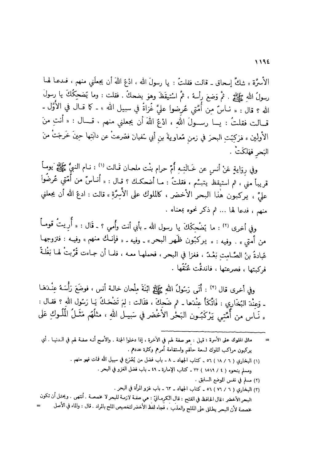 وفي رواية عن أنس عن خالته أم حرام بنت ملحان قالت (1): نام النبي صلى الله عليه وسلم يوماً قريباً مني، ثم استيقظ يتبسم، فقلت: ما أضحكك؟ قال: "أناس من أمتي عُرضوا عليَّ، يركبون هذا البحر الأخضر، كالملوك على الأسرة" قالت: ادع الله أن يجعلني منهم، فدعا لها ... ثم ذكر نحوه بمعناه.