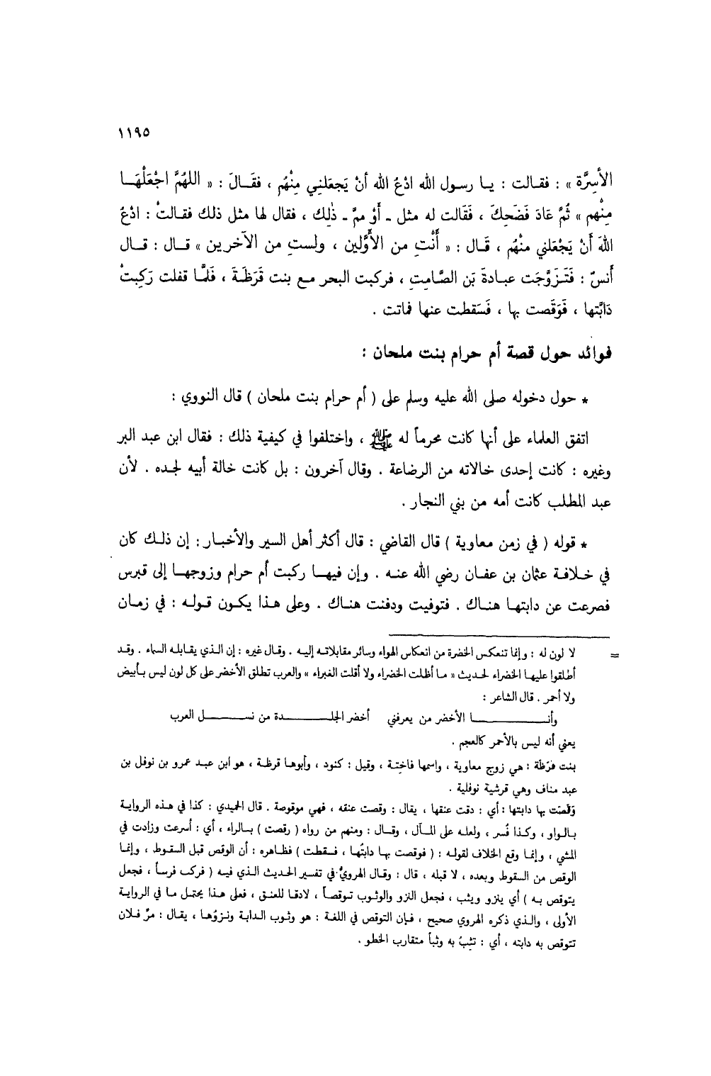 الأسرة": فقالت: يا رسول الله ادعُ الله أنْ يجعلني منهم، فقال: "اللهم اجعلها منهم" ثم عاد فضحك، فقالت له مثل - أو مم- ذلك، فقال لها مثل ذلك فقالت: ادعُ الله أن يجعلني منهم، قال: "أنت من الأولين، ولست من الآخرين" قال: قال أنس: فتزوجت عبادة بن الصامت، فركبت البحر مع بنت قرظة" فلما قفلت ركبتْ دابتها، فوقصت بها، فسقطت عنها فماتت.