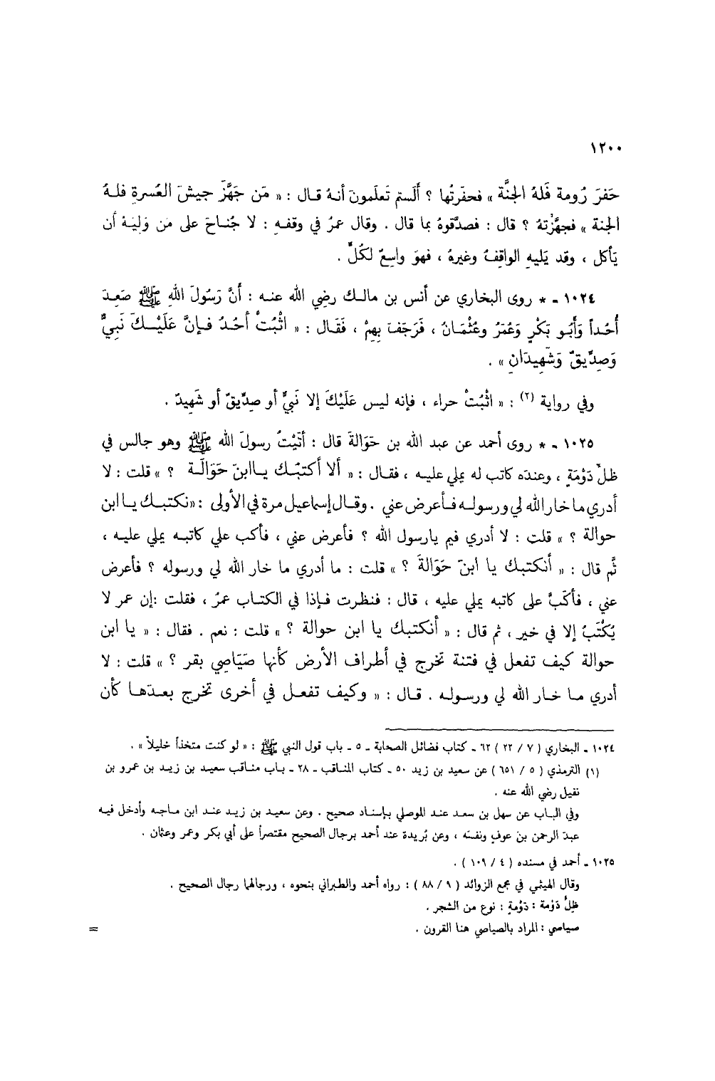 1025 - * روى أحمد عن عبد الله بن حوالة قال: أتيتُ رسول الله صلى الله عليه وسلم وهو جالس في ظل دومةٍ، وعنده كاتب له يملي عليه، فقال: "ألا أكتبُك يا ابن حوالة؟ " قلت: لا أدري ما خار الله لي ورسوله فأعرض عني. وقال إسماعيل مرة في الأولى: "نكتبك يا ابن حوالة؟، قلت: لا أدري فيم يا رسول الله؟ فأعرض عني، فأكب علي كاتبه يملي عليه، ثم قال: "أنكتبك يا ابن حوالة؟ " قلت: ما أدري ما خار الله لي ورسوله؟ فأعرض عني، فأكب على كاتبه يملي عليه، قال: فنظرت فإذا في الكتاب عمر، فقلت: إن عمر لا يكتبُ إلا في خير، ثم قال: "أنكتبك يا ابن حوالة؟ " قلت: نعم. فقال: "يا ابن حوالة كيف تفعل في فتنة تخرج في أطراف الأرض كأنها صياصي بقر؟ " قلت: لا أدري ما خار الله لي ورسوله. قال: "وكيف تفعل في أخرى تخرج بعدها كأن