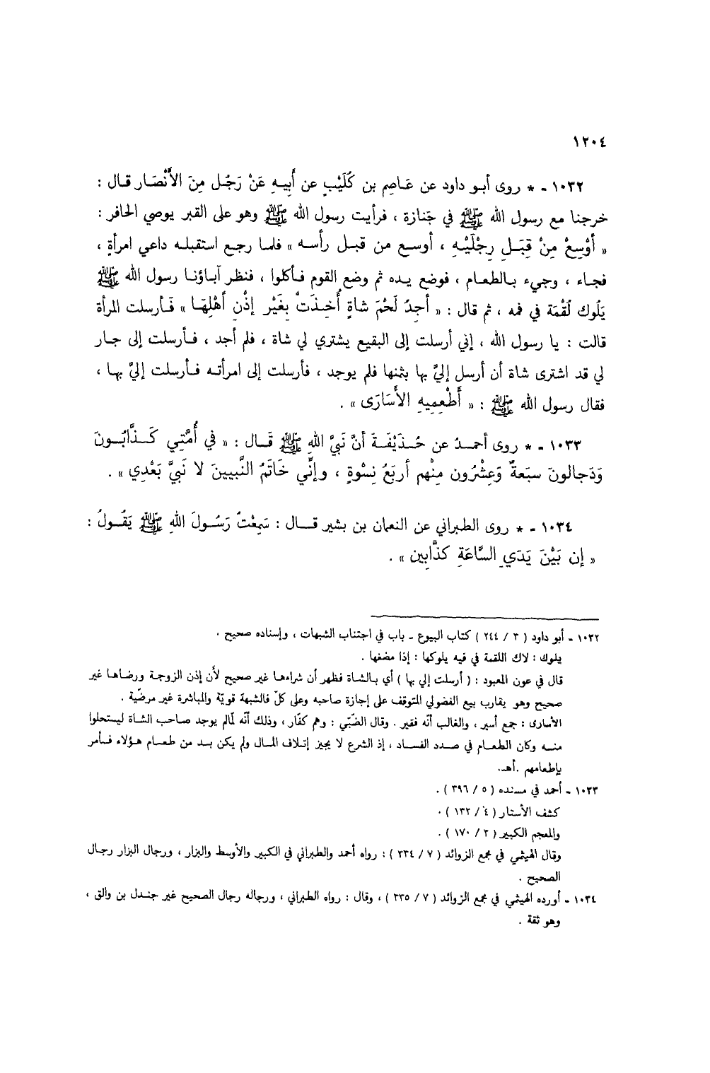 1032 - * روى أبو داود عن عاصم بن كُليب عن أبيه عن رجل من الأنصار قال: خرجنا مع رسول الله صلى الله عليه وسلم في جنازة، فرأيت رسول الله صلى الله عليه وسلم وهو على القبر يوصي الحافر: "أوسِعْ من قِبَلِ رجليه، أوسع من قبل رأسه" فلما رجع استقبله داعي امرأة، فجاء، وجيء بالطعام، فوضع يده ثم وضع القوم فأكلوا، فنظر آباؤنا رسول الله صلى الله عليه وسلم يلوك لقمة في فمه، ثم قال: "أجِدُ لحم شاةٍ أُخذتْ بغير إذن أهلها" فأرسلت المرأة قالت: يا رسول الله، إني أرسلت إلى البقيع يشتري لي شاة، فلم أجد، فأرسلت إلى جار لي قد اشترى شاة أن أرسل إليَّ بها بثمنها فلم يوجد، فأرسلت إلى امرأته فأرسلت إليَّ بها، فقال رسول الله صلى الله عليه وسلم: "أطعميه الأسارى".