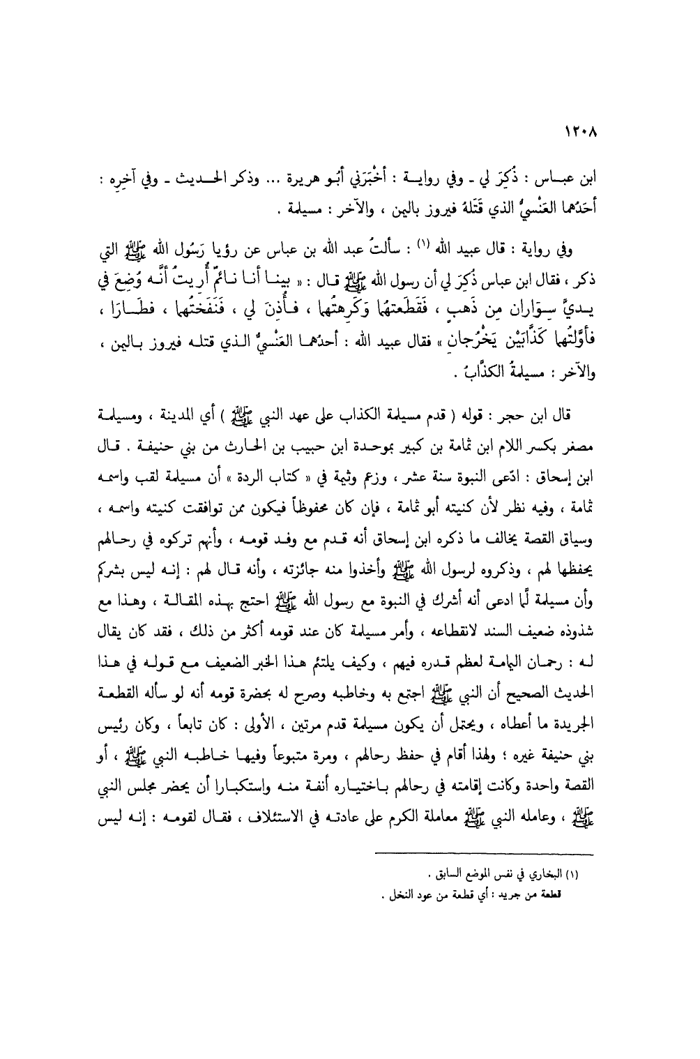 وفي رواية: قال عبيد الله (1): سألت عبد الله بن عباس عن رؤيا رسول الله صلى الله عليه وسلم التي ذكر، فقال ابن عباس ذُكِرَ لي أن رسول الله صلى الله عليه وسلم قال: "بينا أنا نائم أُريتُ أنه وُضِعَ في يدي سواران من ذهبٍ، فقطعتهُما وكرهتُهما، فأّذن لي، فنفختُهما، فطارا، فأولتهما كذابين يخرجان" فقال عبيد الله: أحدهما العنسي الذي قتله فيروز باليمن، والآخر: مسيلمة الكذاب.