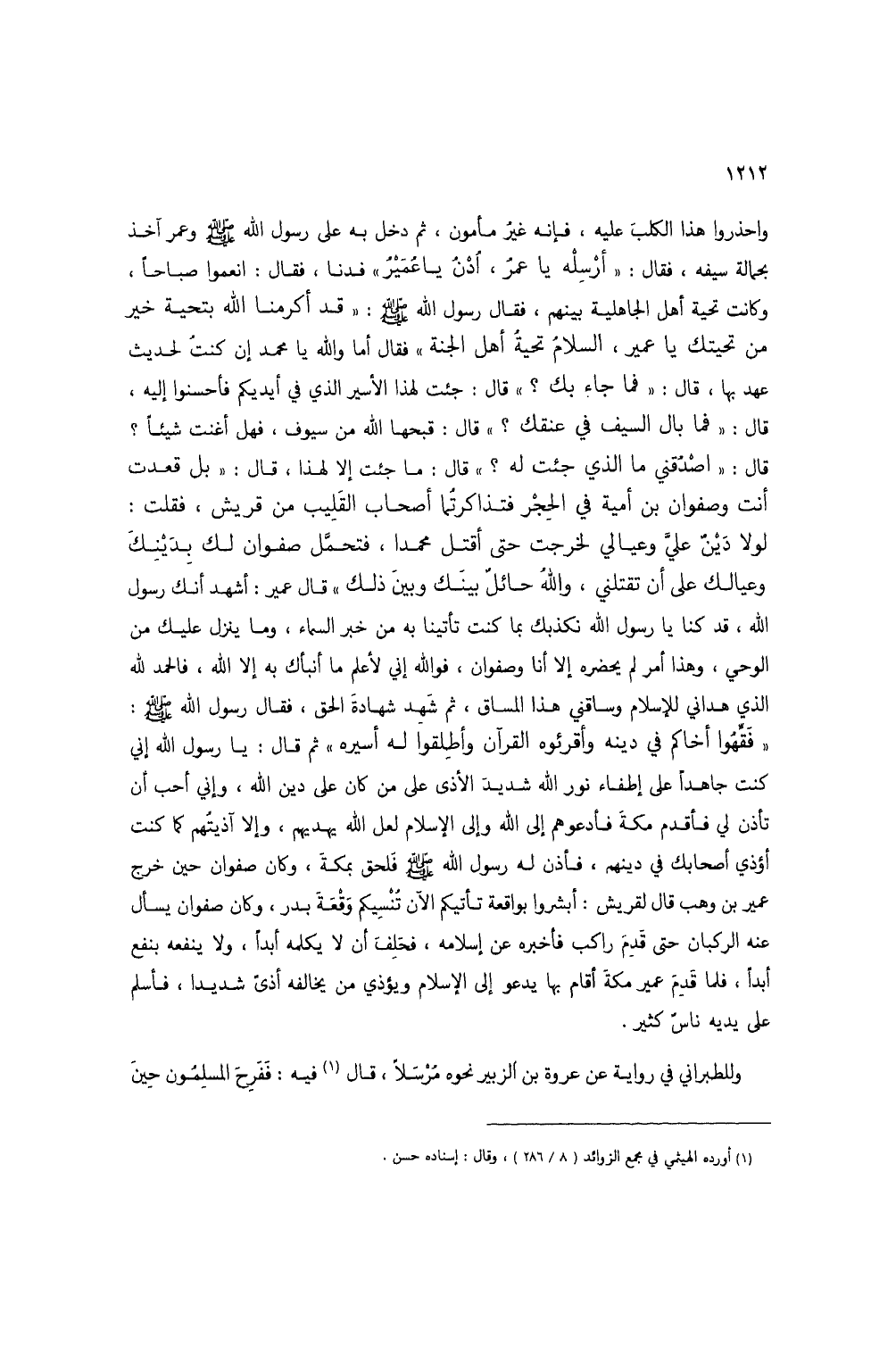 واحذروا هذا الكلب عليه، فإنه غير مأمون، ثم دخل به على رسول الله صلى الله عليه وسلم وعمر آخذ بحمالة سيفه، فقال: "أرسِله يا عمر، أدْنُ يا عميرُ" فدنا، فقال: انعموا صباحاً، وكانت تحية أهل الجاهلية بينهم، فقال رسول الله صلى الله عليه وسلم: "قد أكرمنا الله بتحية خير من تحيتك يا عمير، السلام تحيةُ أهل الجنة" فقال أما والله يا محمد إن كنتُ لحديث عهد بها، قال: "فما جاء بك؟ " قال: جئت لهذا الأسير الذي في أيديكم فأحسنوا إليه، قال: "فما بال السيف في عنقك؟ " قال: قبحها الله من سيوف، فهل أغنت شيئاً؟ قال: "اصدقني ما الذي جئت له"؟ قال: ما جئت إلا لهذا، قال: "بل قعدت أنت وصفوان بن أمية في الحِجْر فتذاكرتُما أصحاب القَلِيب من قريش، فقلت: لولا دينٌ علي وعيالي لخرجت حتى أقتل محمداً، فتحمل صفوان لك بدينك وعيالك على أن تقتلني، والله حائلٌ بينك وبين ذلك" قال عمير: أشهد أنك رسول الله، قد كنا يا رسول الله نكذبك بما كنت تأتينا به من خبر السماء، وما ينزل عليك من الوحي، وهذا أمر لم يحضره إلا أنا وصفوان، فوالله إني لأعلم ما أنبأك به إلا الله، فالحمد لله الذي هداني للإسلام وساقني هذا المساق، ثم شهد شهادة الحق، فقال رسول الله صلى الله عليه وسلم: "فقهُوا أخاكم في دينه وأقرئوه القرآن وأطلقوا له أسيره" ثم قال: يا رسول الله إني كنت جاهداً على إطفاء نور الله شديد الأذى على من كان على دين الله، وإني أحب أن تأذن لي فأقدم مكة فأدعوهم إلى الله وإلى الإسلام لعل الله يهديهم، وإلا آذيتهم كما كنت أؤذي أصحابك في دينهم، فأذن له رسول الله صلى الله عليه وسلم فلحق بمكة، وكان صفوان حين خرج عمير بن وهب قال لقريش: أبشروا بواقعة تأتيكم الآن تُنسيكم وقعة بدر، وكان صفوان يسأل عنه الركبان حتى قدم راكب فأخبره عن إسلامه، فحلف أن لا يكلمه أبداً، ولا ينفعه بنفع أبداً، فلما قَدم عمر مكة أقام بها يدعو إلى الإسلام ويؤذي من يخالفه أذى شديداً، فأسلم على يديه ناسٌ كثير.