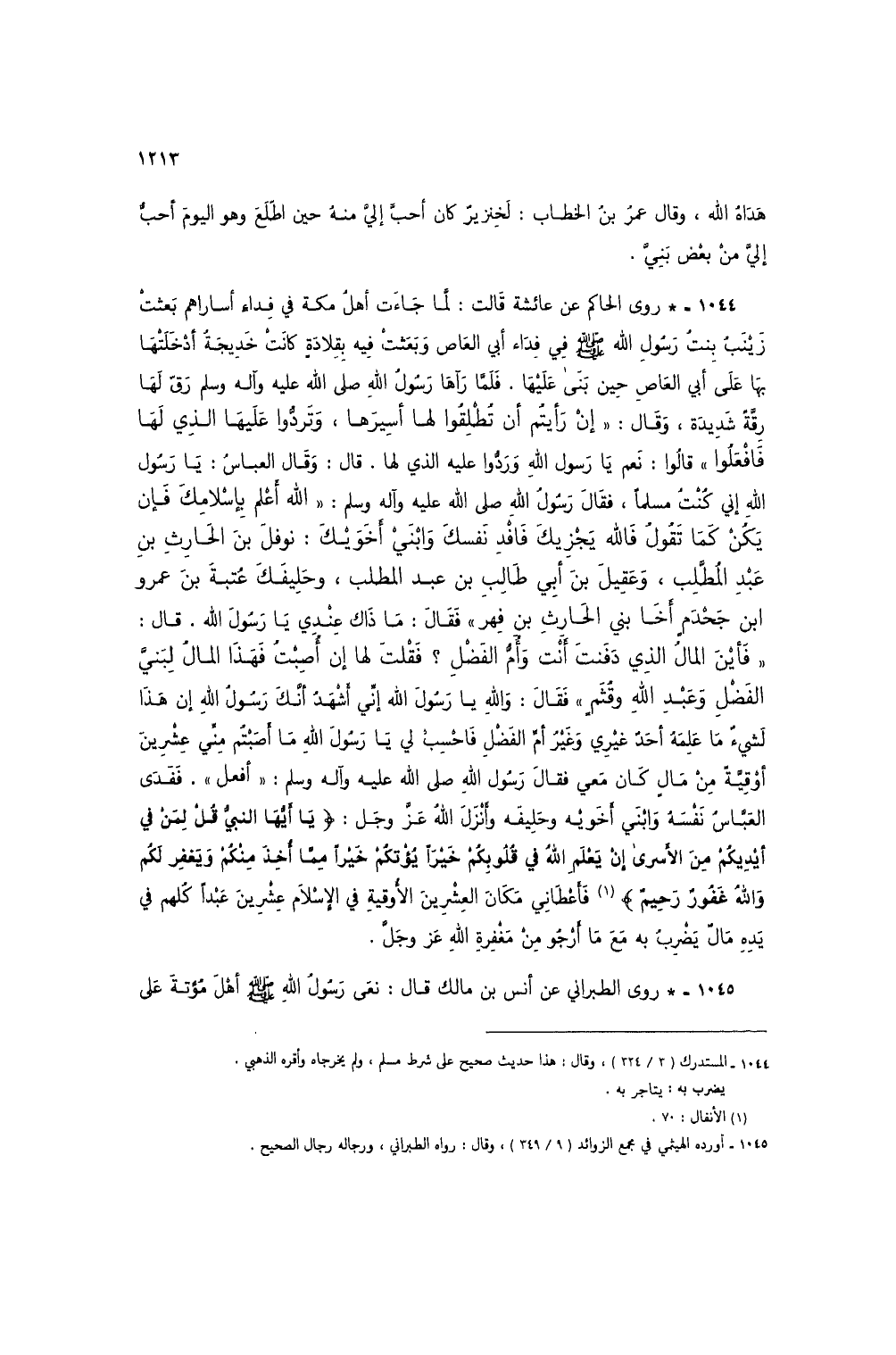 1044 - * روى الحاكم عن عائشة قالت: لما جاءت أهل مكة في فداء أسارهم بعثتْ زينبُ بنتُ رسول الله صلى الله عليه وسلم في فداء أبي العاص وبعثتْ فيه بقلادة كانت خديجة أدخلتها بها على أبي العاص حين بنى عليها. فلما رآها رسول الله صلى الله عليه وآله وسلم رق لها رقة شديدة، وقال: "إن رأيتُم أن تُطلقوا لها أسيرها، وتردُّوا عليها الذي لها فافعلوا" قالوا: نعم يا رسول الله وردوا عليه الذي لها. قال: وقال العباس: يا رسول الله إني كنتُ مسلماً، فقال رسول الله صلى الله عليه وآله وسلم: "الله أعلم بإسلامك فإن يكنْ كما تقول فالله يجزيك فافد نفسك وابني أخويك: نوفل بن الحاث بن عبد المطلب، وعقيل بن أبي طالب بن عبد المطلب، وحليفك عُتبة بن عمرو بن جحدم أخا بني الحارث بن فهر" فقال: ما ذاك عندي يا رسول الله. قال: "فأين المالُ الذي دفنت أنت وأمُّ الفضل؟ فقلت لها إن أُصبتُ فهذا المال لبني الفضل وعبد الله وقُثَمٍ" فقال: والله يا رسول الله إني أشهدُ أنك رسول الله إن هذا لشيء ما علمَهُ أحدٌ غيري وغيرُ أم الفضل فاحسب لي يا رسول الله ما أصبتم مني عشرين أوقية من مالٍ كان معي فقال رسول الله صلى الله عليه وآله وسلم: "أفعل". ففدى العباس نفسه وابني أخويه وحليفه وأنزل الله عز وجل: {يَاأَيُّهَا النَّبِيُّ قُلْ لِمَنْ فِي أَيْدِيكُمْ مِنَ الْأَسْرَى إِنْ يَعْلَمِ اللَّهُ فِي قُلُوبِكُمْ خَيْرًا يُؤْتِكُمْ خَيْرًا مِمَّا أُخِذَ مِنْكُمْ وَيَغْفِرْ لَكُمْ وَاللَّهُ غَفُورٌ رَحِيمٌ} (1) فأعطاني مكان العشرين الأوقية في الإسلام عشرين عبداً كلهم في يده مالٌ يضربُ به مع ما أرجو من مغفرة الله عز وجل.