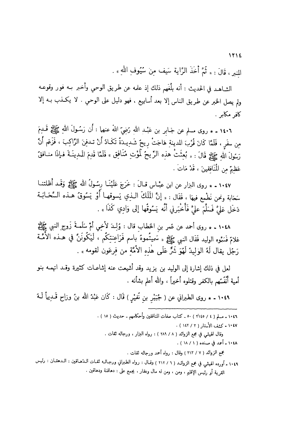 1046 - * روى مسلم عن جابر بن عبد الله رضي الله عنهما: أن رسول الله صلى الله عليه وسلم قَدِمَ من سفرٍ، فلما كان قُربَ المدينة هاجت ريحٌ شديدةٌ تكادُ أن تدفن الراكب، فزعم أن رسول الله صلى الله عليه وسلم قال: "بُعثت هذه الريحُ لموت منافق" فلما قدم المدينة فإذا منافق عظيم من المنافقين، قد مات.