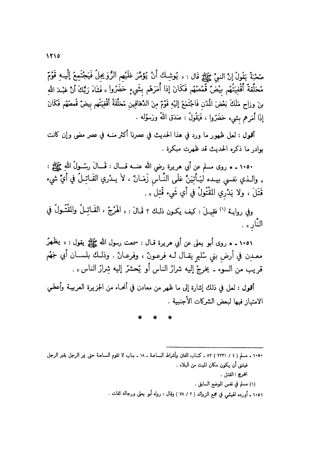 1051 - * روى أبو يعلي عن أبي هريرة قال: سمعت رسول الله صلى الله عليه وسلم يقول: "يظهرُ معدن في أرض بني سُليمٍ يقال له فرعونُ، وفرعانُ. وذلك بلسان أبي جهم قريب من السوء- يخرجُ إليه شرارُ الناس أو يُحشر إليه شرارُ الناس".