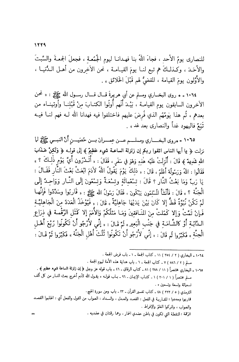 1064 - * روى البخاري ومسلم عن أبي هريرة قال قال رسول الله صلى الله عليه وسلم: "نحن الآخرون السابقون يوم القيامة، بيد أنهم أُوتوا الكتاب من قبلنا وأوتيناه من بعدهم، ثم هذا يومهم الذي فُرض عليهم فاختلفوا فيه فهدانا الله له فهم لنا فيه تبع فاليهود غداً والنصارى بعد غد".