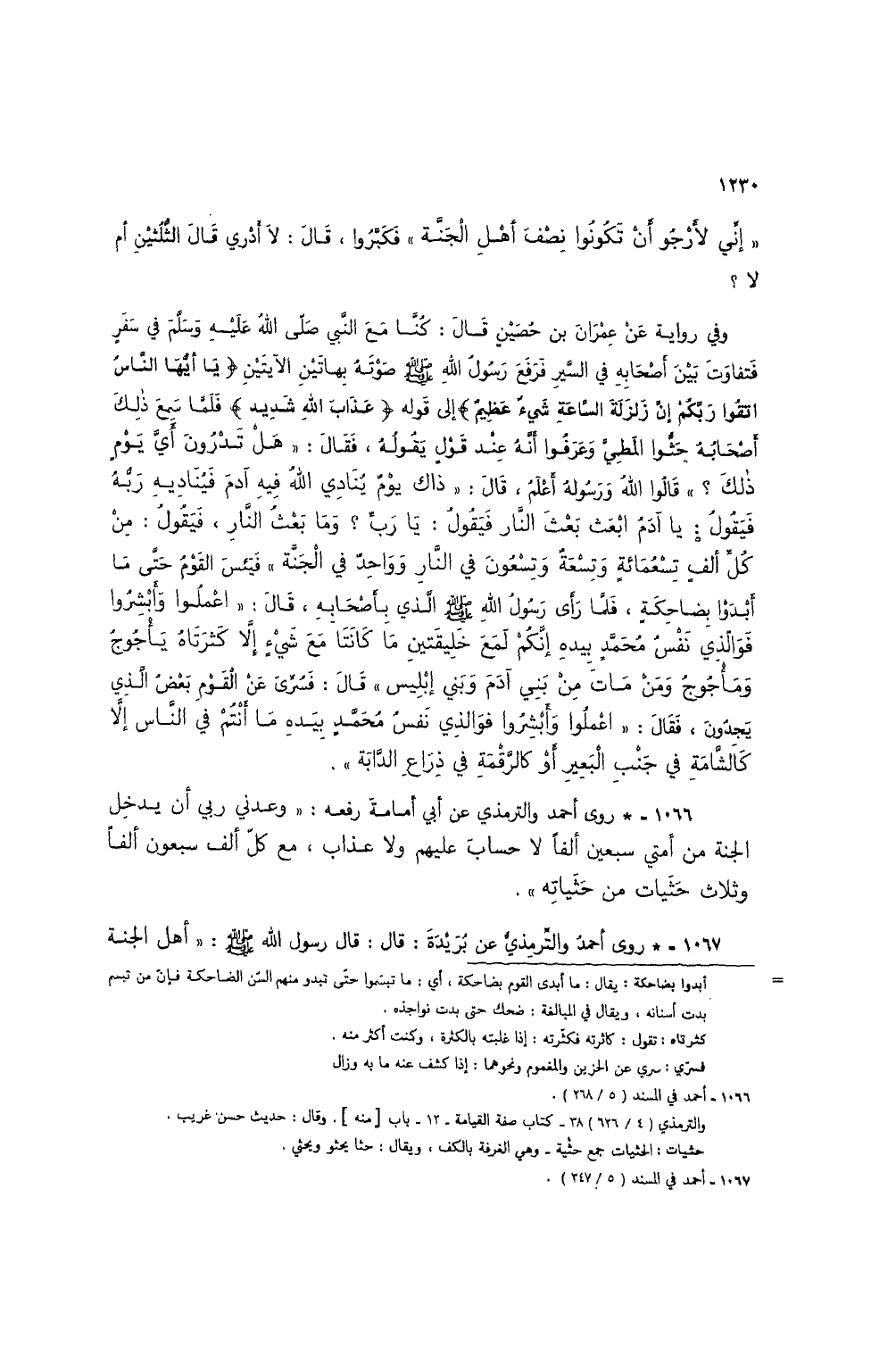 1066 - * روى أحمد والترمذي عن أبي أمامة رفعه: "وعدني ربي أن يدخل الجنة من أمتي سبعين ألفاً لا حساب عليهم ولا عذاب، مع كل ألف سبعون ألف وثلاث حثيات من حثياته".
