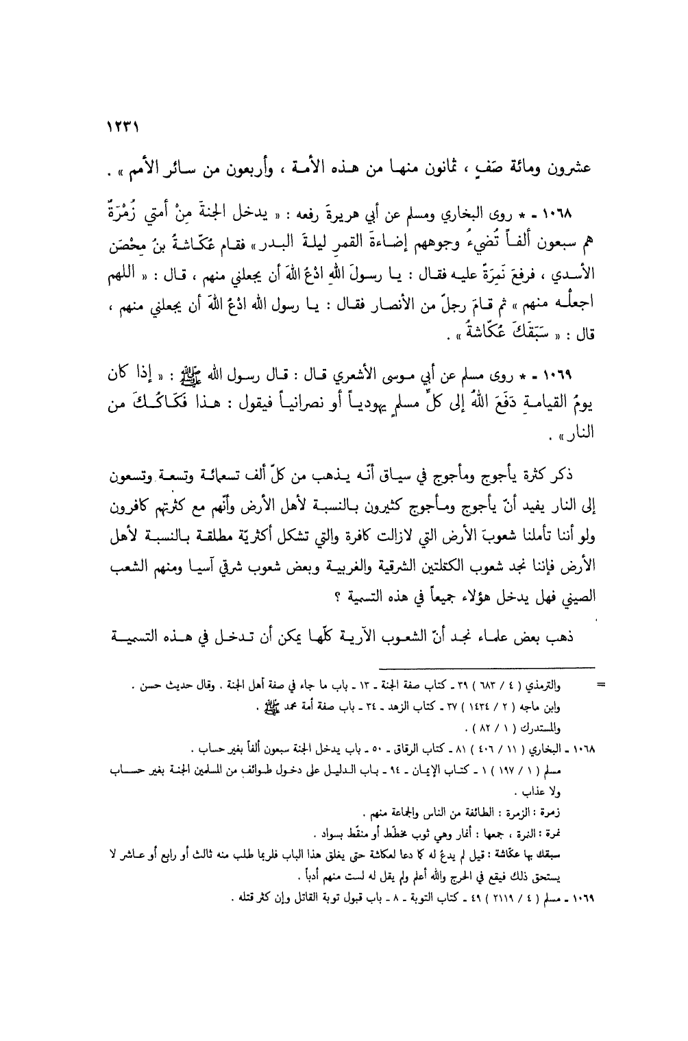 1069 - * روى مسلم عن أبي موسى الأشعري قال: قال رسول الله صلى الله عليه وسلم: "إذا كن يوم القيامة دفع الله إلى كل مسلمٍ يهودياً أو نصرانياً فيقول: هذا فكاكُك من النار".