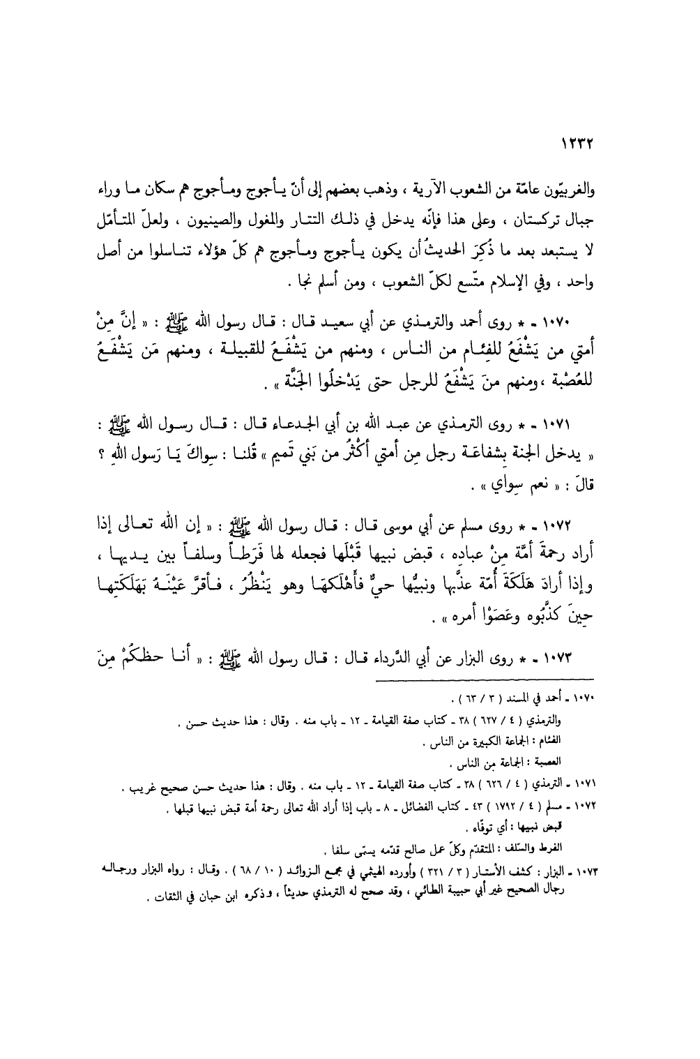 1070 - * روى أحمد والترمذي عن أبي سعيد قال: قال رسول الله صلى الله عليه وسلم: "إن مِنْ أمتي من يشفعُ للفئام من الناس، ومنهم مني شفع للقبيلة، ومنهم من يشفعُ للعصبة، ومنهم من يشفعُ للرجل حتى يدخلوا الجنة".