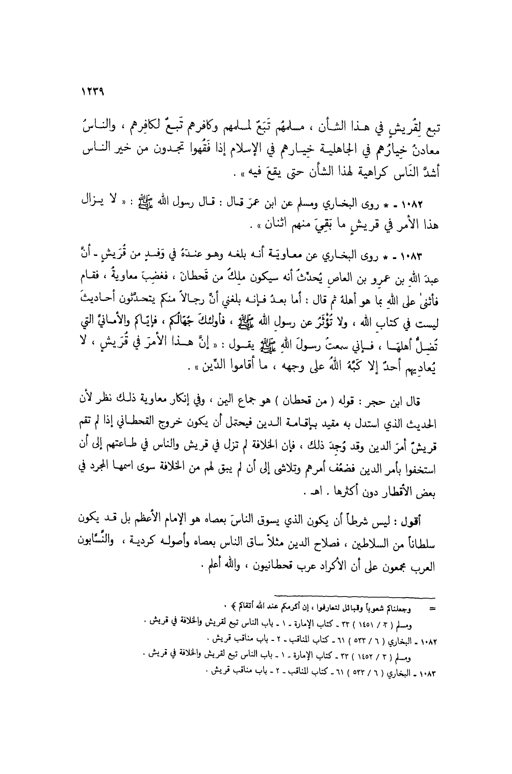 1083 - * روى البخاري عن معاوية أنه بلغه وهو عندهُ في وفدٍ من قريش - أن عبد الله بن عمرو بن العاص يُحدث أنه سيكون ملكٌ من قحطان، فغضب معاوية، فقام فأثنى على الله بما هو أهله ثم قال: أما بعدُ فإنه بلغني أن رجالاً منكم يتحدثون أحاديث ليست في كتاب الله، ولا تؤثرُ عن رسول الله صلى الله عليه وسلم، فأولئك جُهالكم، فإياكم والأمانيُّ التي تُضل أهلها، فإني مسعت رسول الله صلى الله عليه وسلم يقول: "إن هذا الأمر في قريشٍ، لا يعاديهم أحد إلا كبهُ الله على وجهه، ما أقاموا الدين".