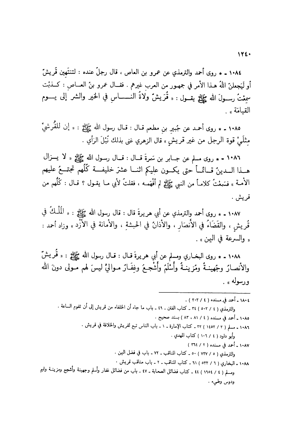 1084 - * روى أحمد والترمذي عن عمرو بن العاص، قال رجل عنده: لتنتهين قُريش أو ليجعلن الله هذا الأمر في جمهور من العرب غيرهم. فقال عمرو بن العاص: كذبت سمعتُ رسول الله صلى الله عليه وسلم يقول: "قريش ولاة الناس في الخير والشر إلى يوم القيامة".
