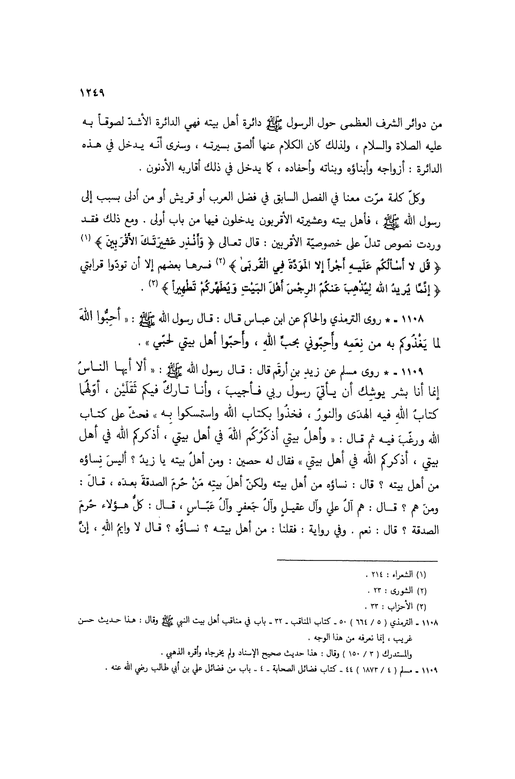 وكل كلمة مرت معنا في الفصل السابق في فضل العرب أو قريش أو من أدلى بسبب إلى رسول الله صلى الله عليه وسلم، فأهل بيته وعشيرته الأقربون يدخلون فيها من باب أولى. ومع ذلك فقد وردت نصوص تدل على خصوصية الأقربين: قال تعالى {وَأَنْذِرْ عَشِيرَتَكَ الْأَقْرَبِينَ} (1) {قُلْ لَا أَسْأَلُكُمْ عَلَيْهِ أَجْرًا إِلَّا الْمَوَدَّةَ فِي الْقُرْبَى} (2) فسرها بعضهم إلا أن تودوا قرابتي {إِنَّمَا يُرِيدُ اللَّهُ لِيُذْهِبَ عَنْكُمُ الرِّجْسَ أَهْلَ الْبَيْتِ وَيُطَهِّرَكُمْ تَطْهِيرًا} (3).