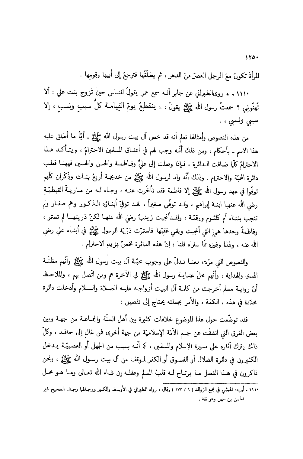 1110 - * روى الطبراني عن جابر أنه سمع عمر يقول للناس حين تزوج بنت علي: ألا تهنوني؟ سمعت رسول الله صلى الله عليه وسلم يقول: "ينقطعُ يوم القيامة كل سببٍ ونسبٍ، إلا سببي ونسبي".