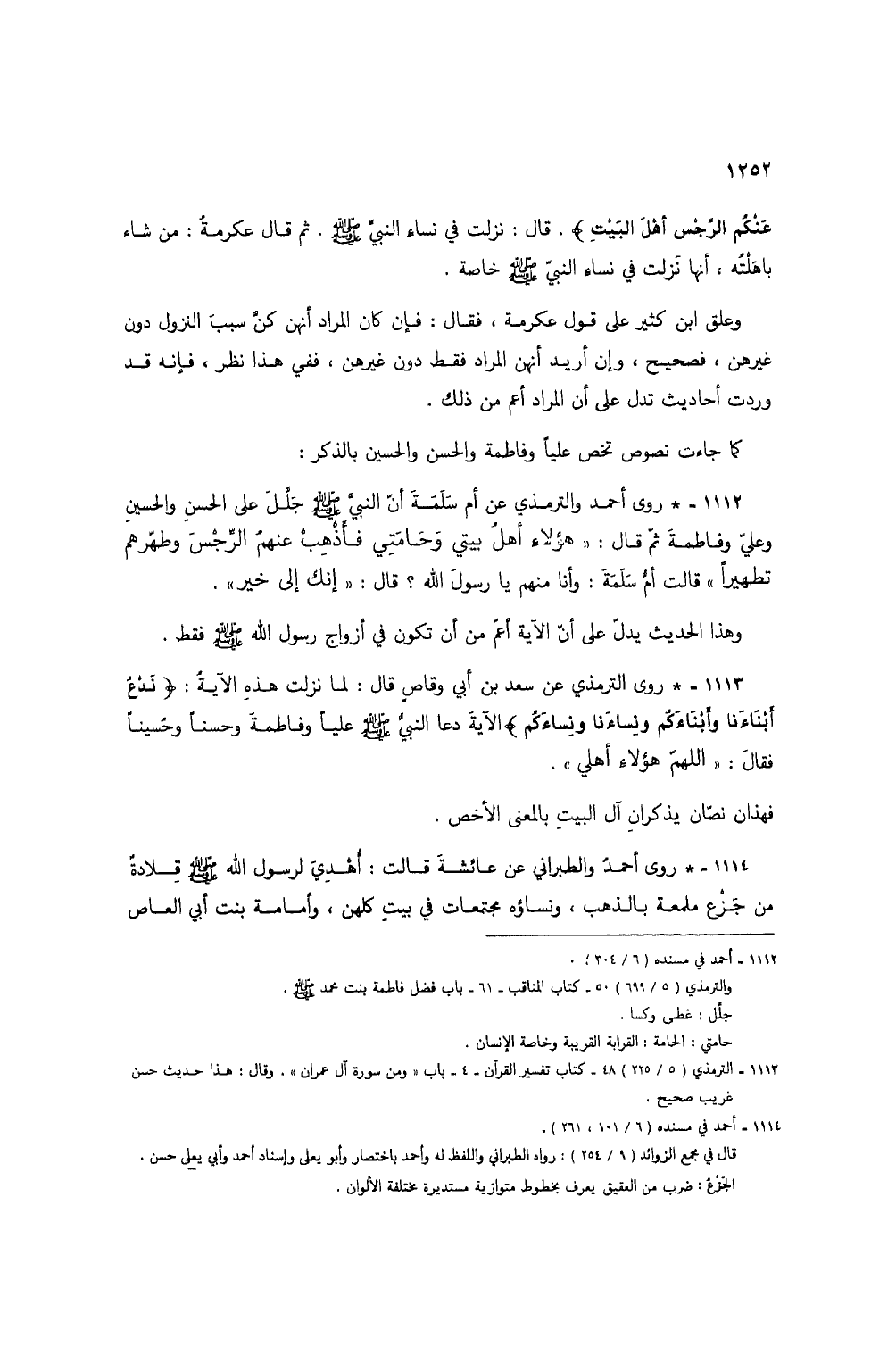 1113 - * روى الترمذي عن سعد بن أبي وقاص قال: لما نزلت هذه الآية: {نَدْعُ أَبْنَاءَنَا وَأَبْنَاءَكُمْ وَنِسَاءَنَا وَنِسَاءَكُمْ} الآية دعا النبي صلى الله عليه سلم علياً وفاطمة وحسناً وحُسيناً فقال: "اللهم هؤلاء أهلي".