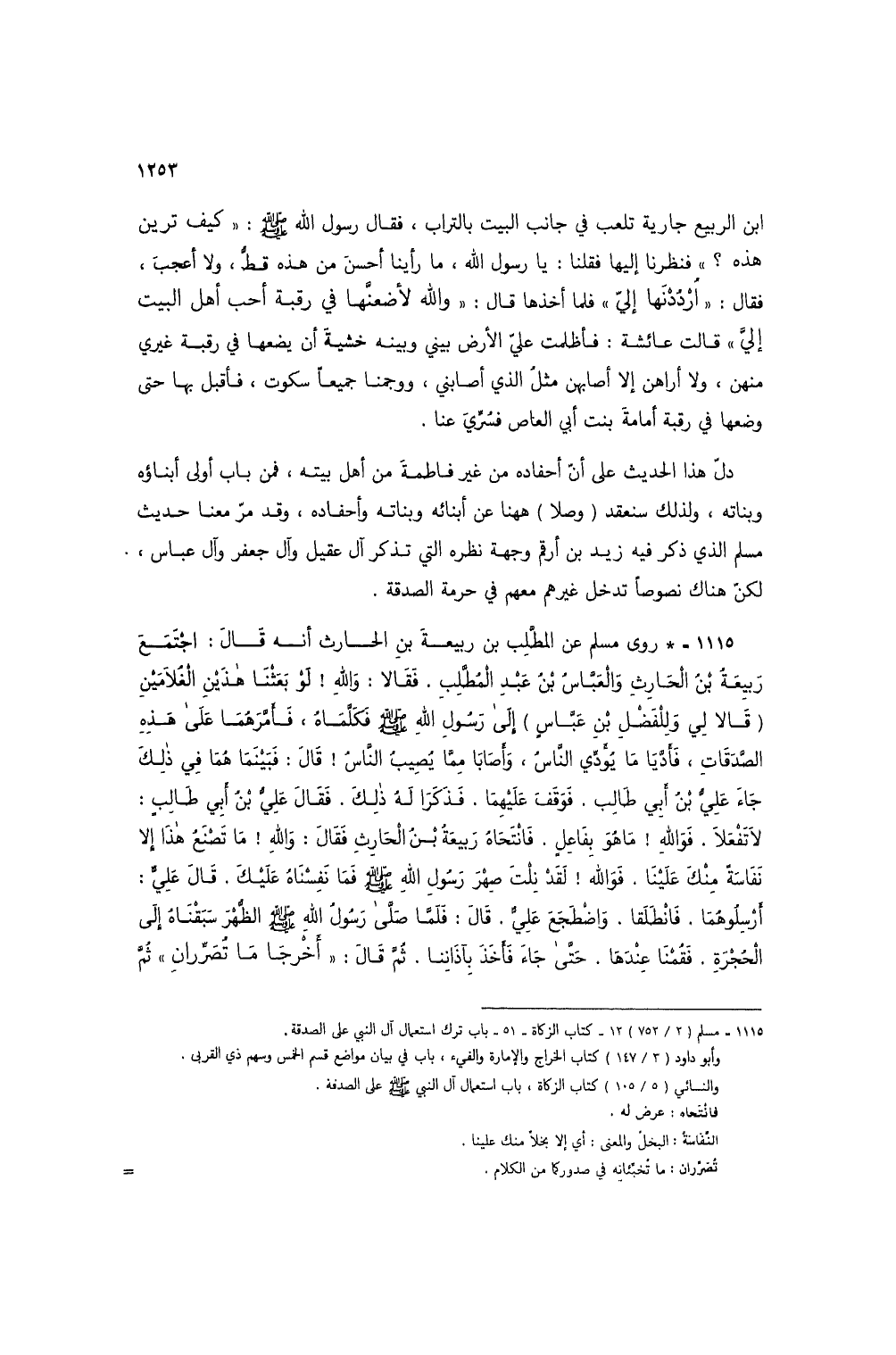1115 - * روى مسلم عن المطلب بن ربيعة بن الحاث أنه قال: اجتمع ربيعةُ بن الحارث والعباس بن عبد المطلب. فقالا: والله! لو بعثنا هذين الغُلامين (قالا لي وللفضل بن عباس) إلى رسول الله صلى الله عليه وسلم فكلماهُ، فأمرهما على هذه الصدقات، فأديا ما يؤدي الناسُ، وأصابا مما يُصيبُ الناسُ! قال: فبينما هما في ذلك جاء علي بن أبي طالب. فوقف عليهما. فذكرا له ذلك. فقال علي بن أبي طالب: لا تفعلا. فوالله! ما هو بفاعلٍ. فانتحاه ربيعةُ بن الحارث فقال: والله! ما تصنعُ هذا إلا نفاسةٌ منك علينا. فوالله! لقد نلتَ صِهرَ رسول الله صلى الله عليه وسلم فما نفسناهُ عليك. قال عليٍّ: أرسلوهما. فانطلقا. واضطجع عليٍّ. قال: فلما صلى رسول الله صلى الله عليه وسلم الظهر سبقناهُ إلى الحُجرةِ فقمنا عندها. حتى جاء فأخذ بآذاننا. ثم قال: "أخرجا ما تُصرِّرانِ" ثم