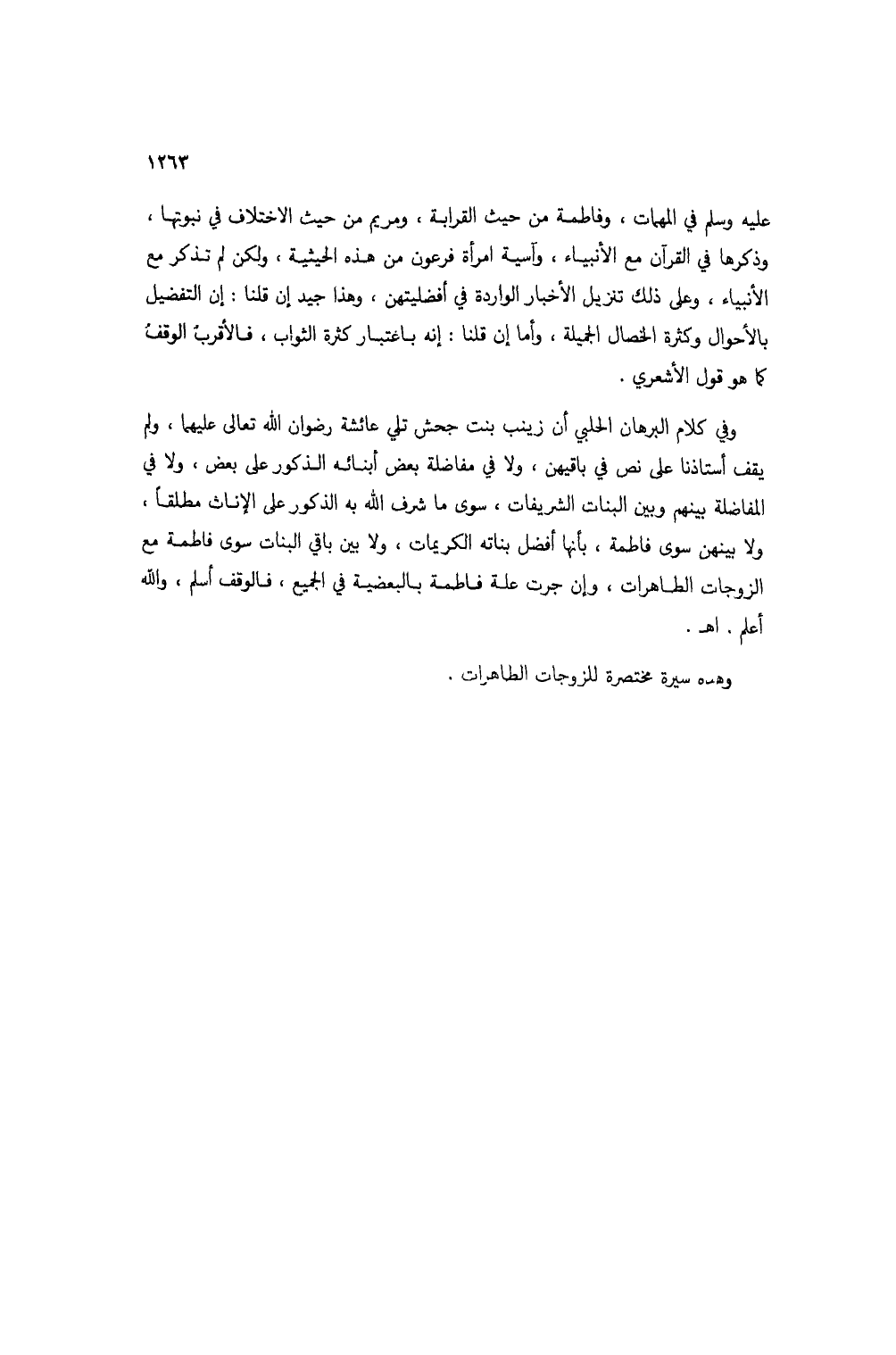 وفي كلام البرهان الحلبي أن زينب بنت جحش تلي عائشة رضوان الله تعالى عليهما، ولم يقف أستاذنا على نص في باقيهن، ولا في مفاضلة بعض أبنائه الذكور على بعض، ولا في المفاضلة بينهم وبين البنات الشريفات، سوى ما شرف الله به الذكور على الإناث مطلقاً، ولا بينهن سوى فاطمة، بأنها أفضل بناته الكريمات، ولا بين باقي البنات سوى فاطمة مع الزوجات الطاهرات، وإن جرت علة فاطمة بالبعضية في الجميع، فالوقف أسلم، والله أعلم. أهـ.