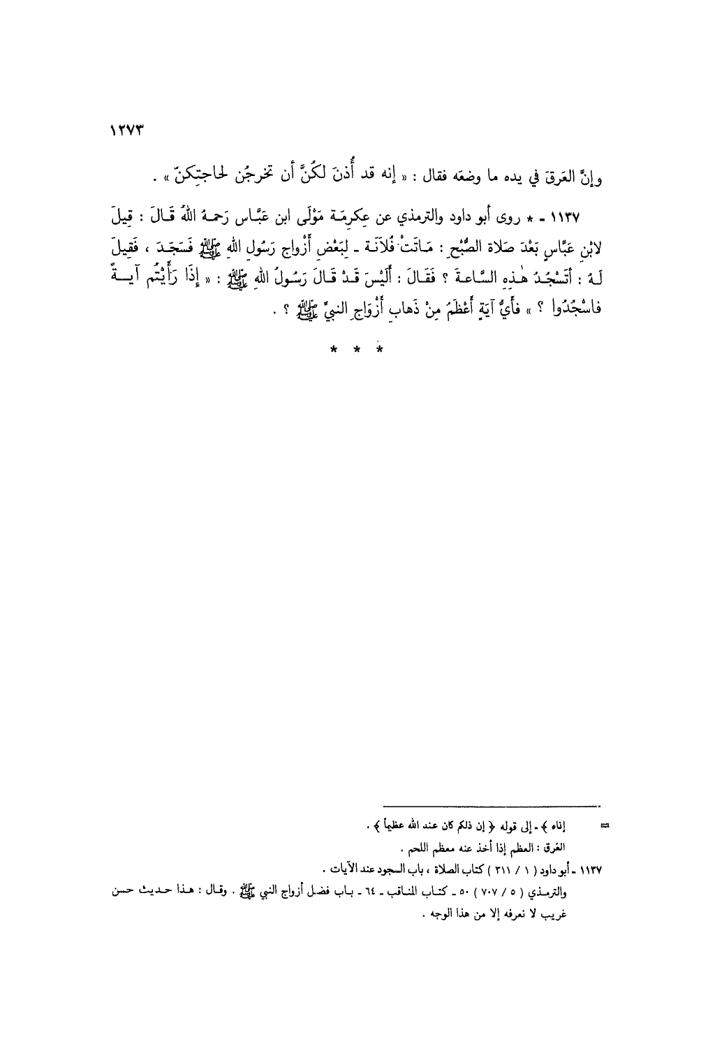 1137 - * روى أبو داود والترمذي عن عكرمة مولى ابن عباس رحمه الله قال: قيل لابن عباس بعد صلاة الصبح: ماتت فلانة - لبعض أزواج رسول الله صلى الله عليه وسلم فسجد، فقيل له: أتسجدُ هذه الساعة؟ فقال: أليس قد قال رسول الله صلى الله عليه وسلم: "إذا رأيتُم آيةً فاسجدوا؟ " فأيُّ آيةٍ أعظم منْ ذهاب أزواج النبي صلى الله عليه وسلم؟.